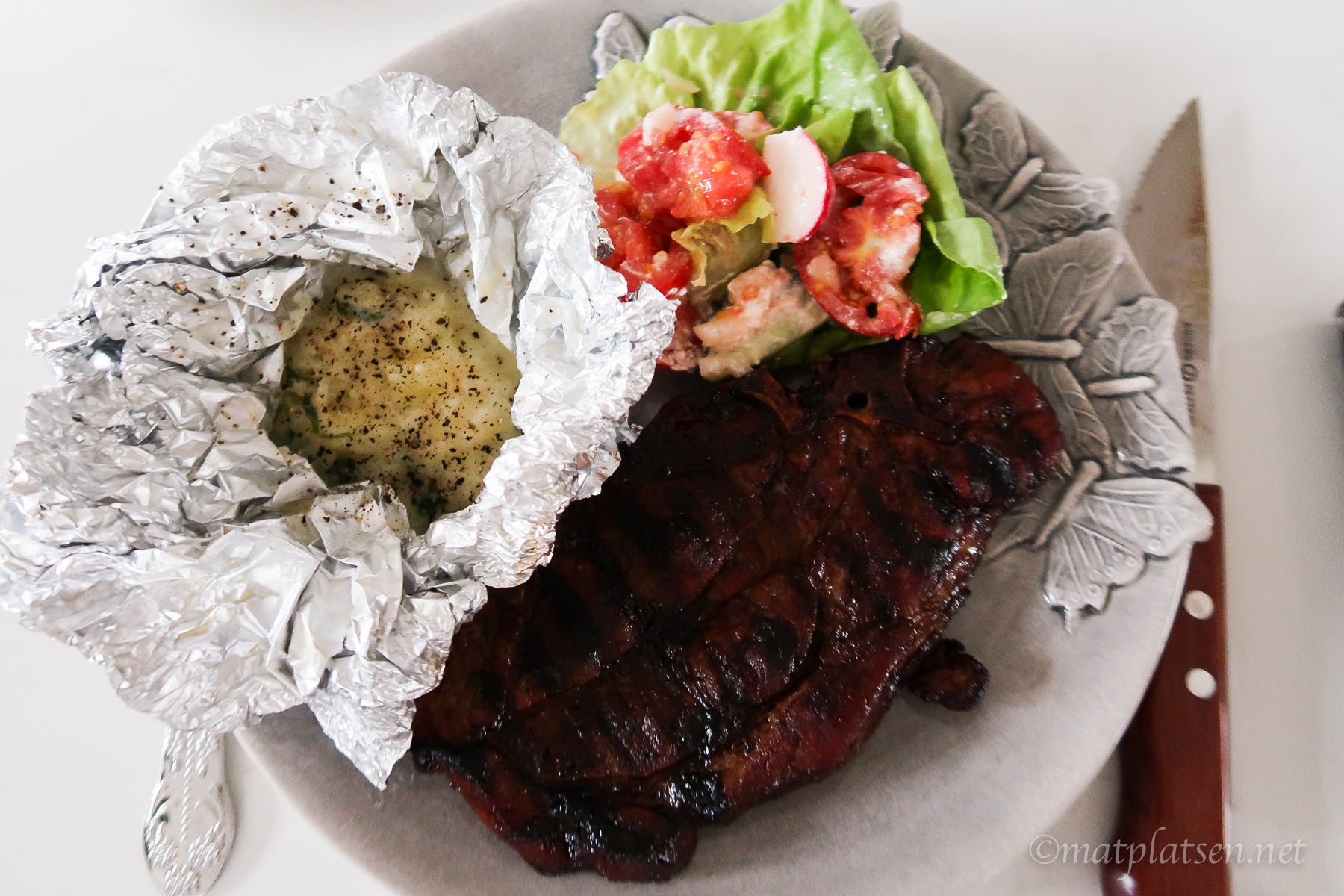 Ett gott grilltips kommer här. Vi hade fyllning över från de grillade tunnbrödsrullarna som vi la i varsitt folieknyte och grillade på grillen. Blir som en blandning mellan potatisgratäng och gratinerat mos, supergott som tillbehör.
