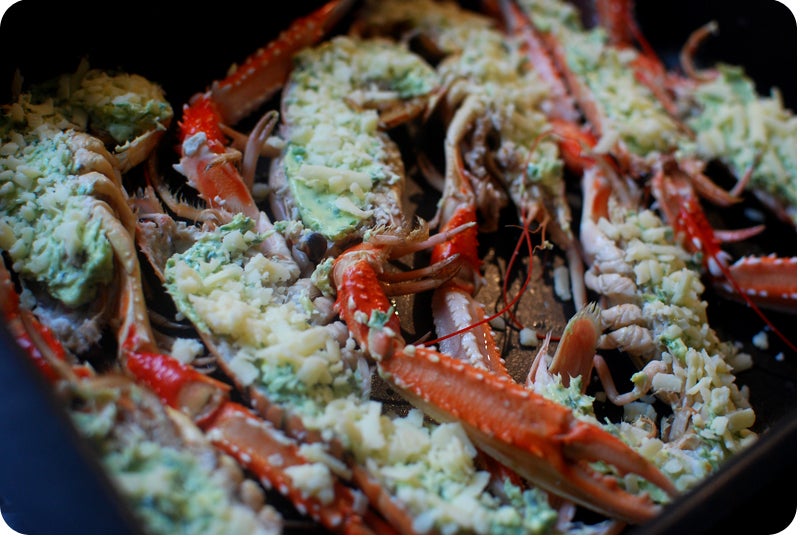 Har dock inget recept för jag har aldrig gjort det själv, men har en vän som bor på en ö och de brukar få kräftor av fiskarna där (bifångster) under sommaren och de brukar alltid bjuda på detta när man är på besök. Men det är nog rätt likt ditt recept med ett kryddsmör på halverade kräftor. Men de brukar ha salvia och citron i. Deras är ju dessutom färska och inte kokta innan och det är sååå gott!