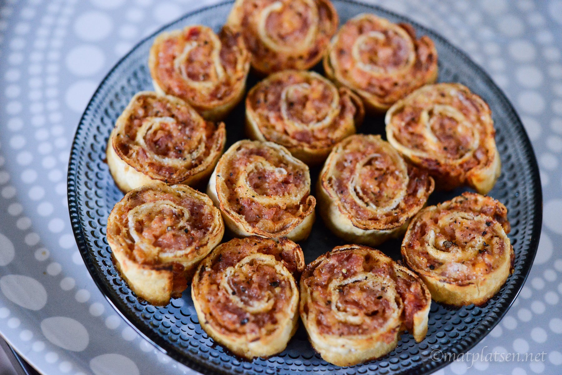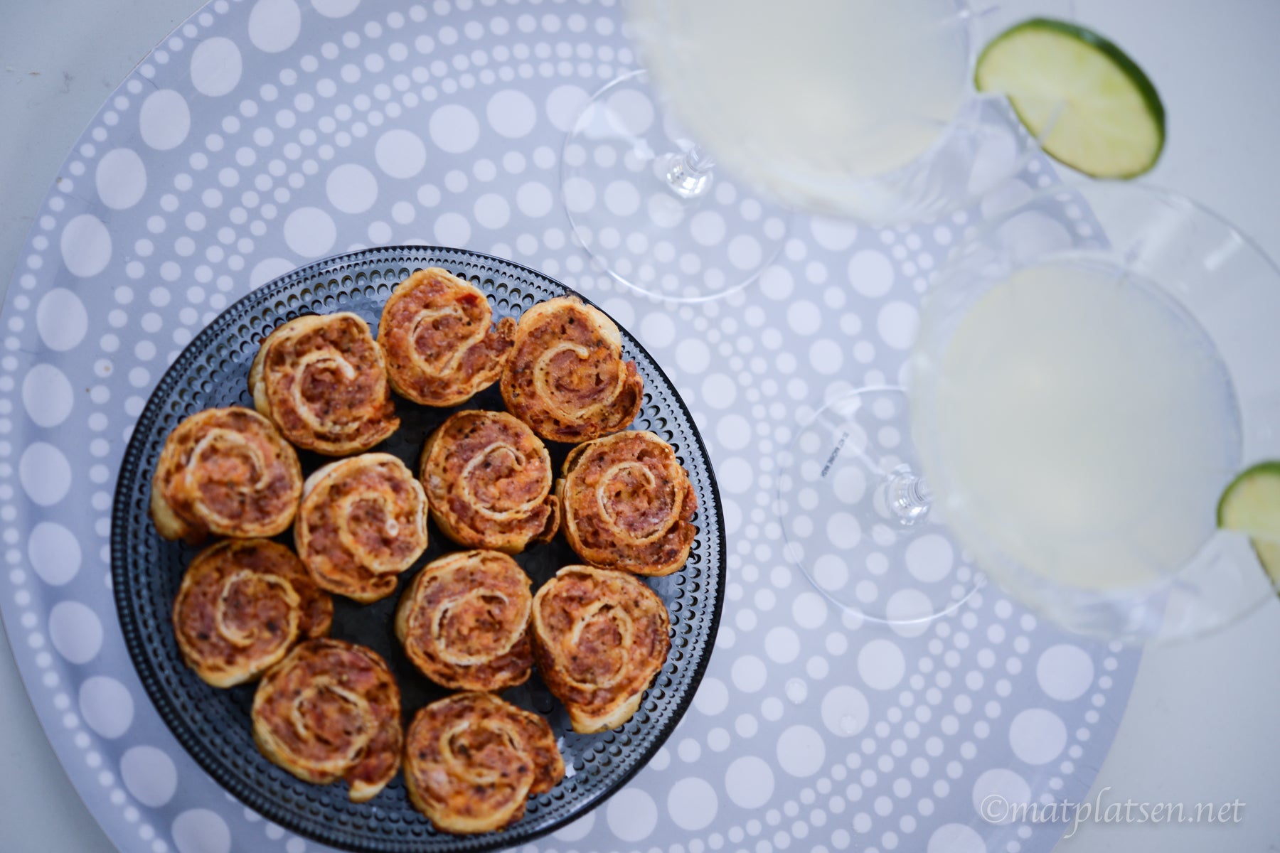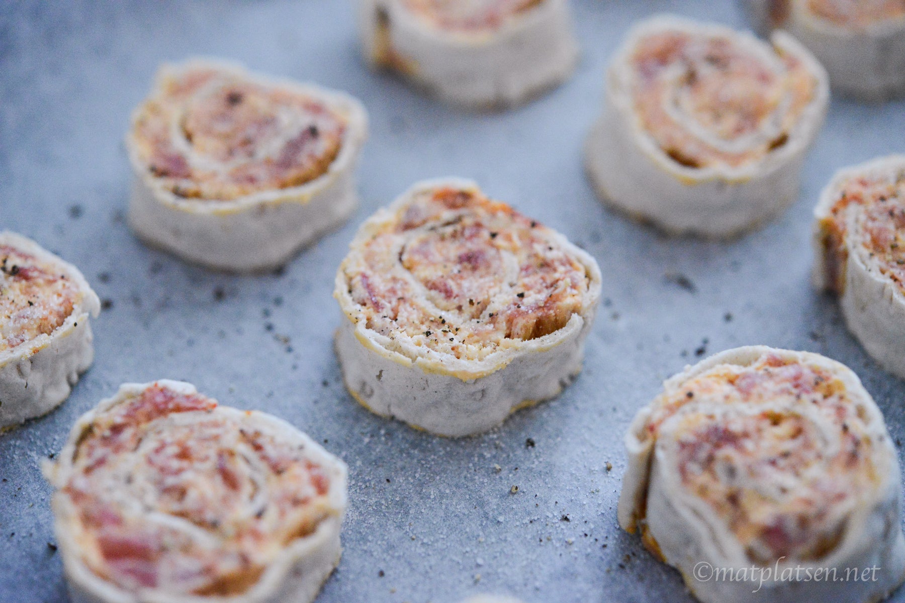 Kan förresten tipsa om ett liknande. Tunnbröd, bred på röd pesto, valnötter och sist västerbottenost! Klipp efter att de varit i ugnen, brödet i mindre bitar/snittar medan det är ljummet. Så gott och enkelt.