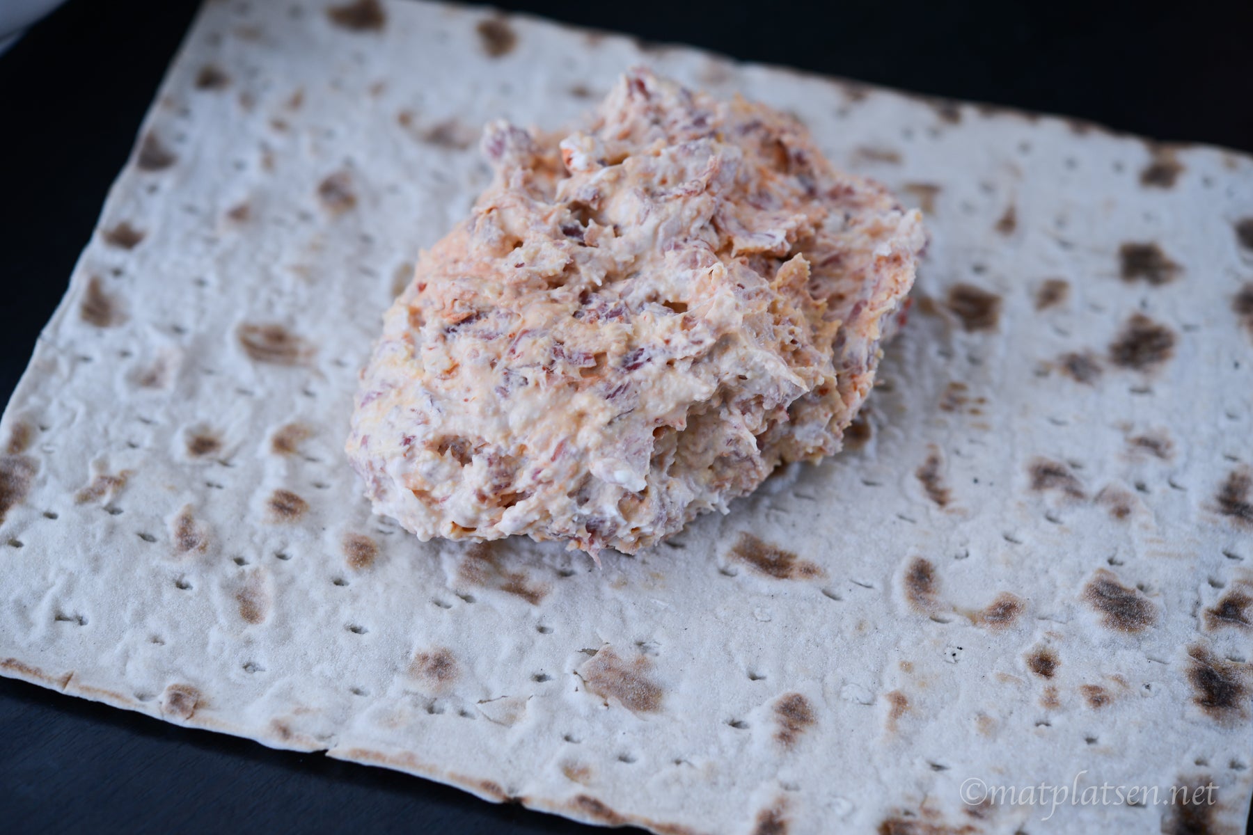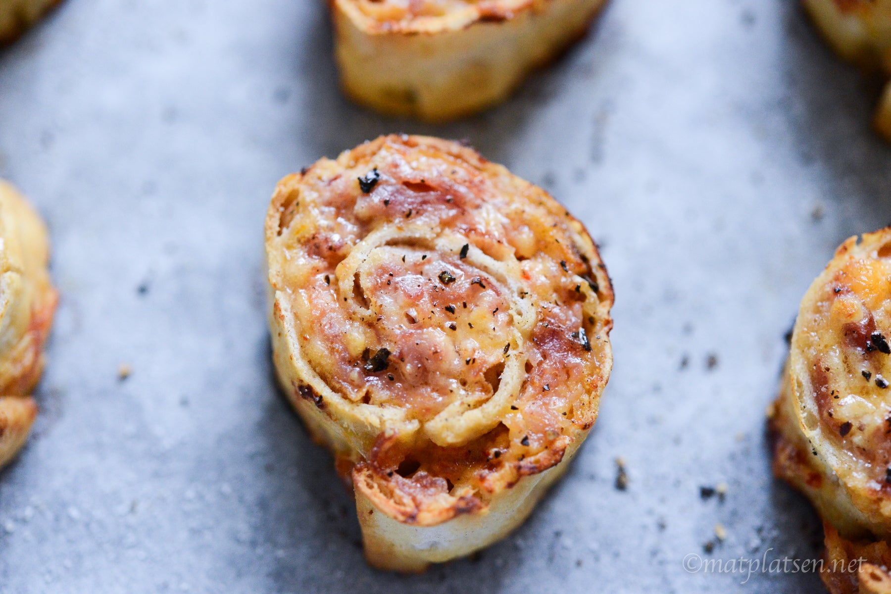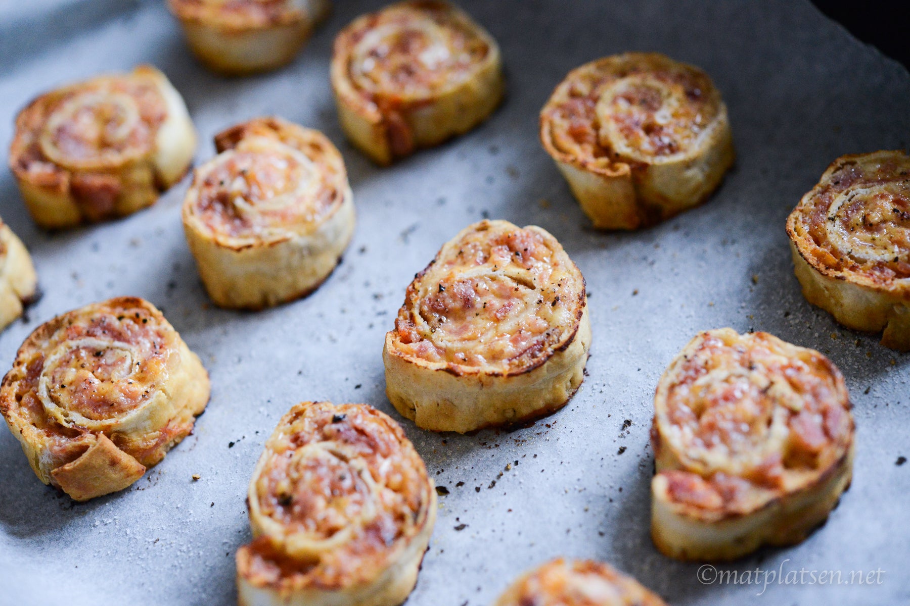 Kan förresten tipsa om ett liknande. Tunnbröd, bred på röd pesto, valnötter och sist västerbottenost! Klipp efter att de varit i ugnen, brödet i mindre bitar/snittar medan det är ljummet. Så gott och enkelt.