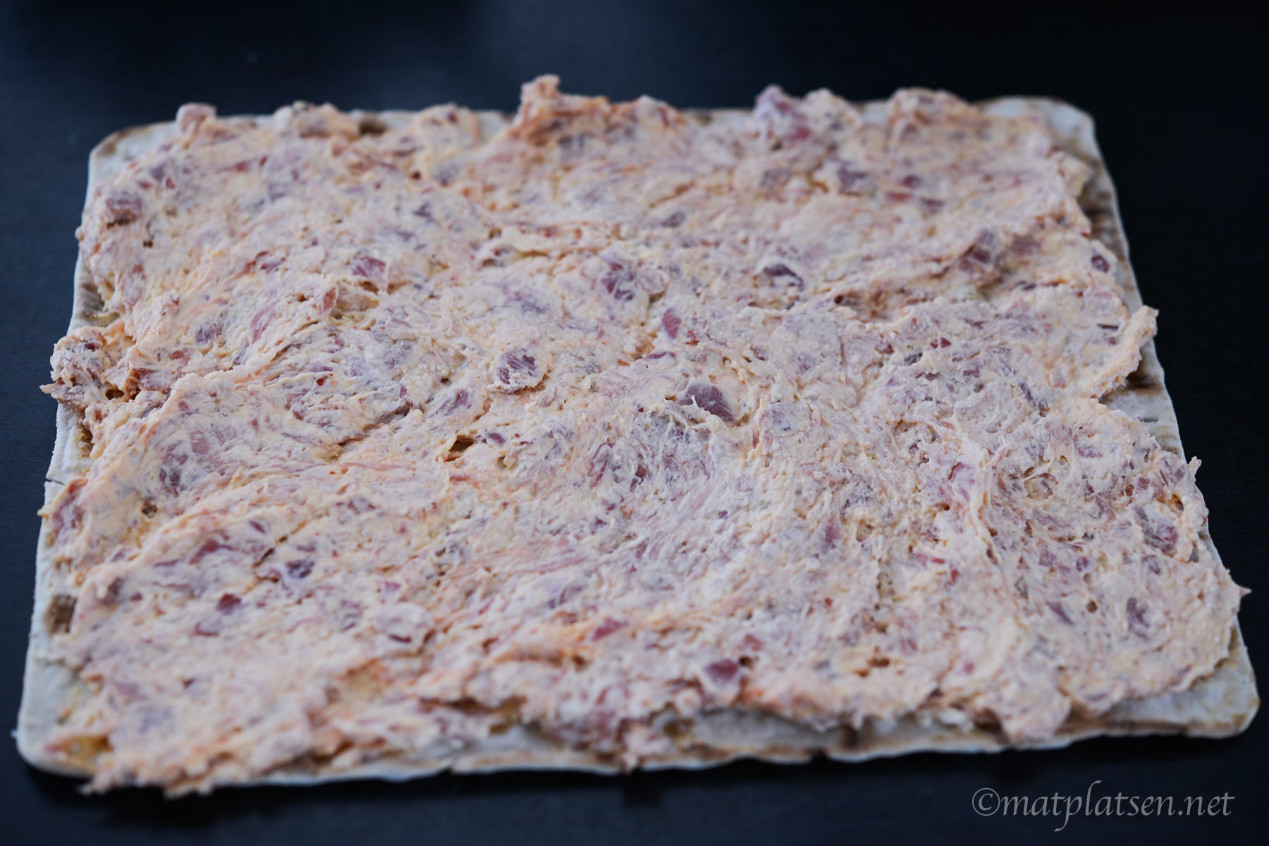Hacka skinkan fint och blanda samman alla ingredienser till röran. Smaka av med salt & peppar. Bred ut röran på tunnbröden och rulla ihop dem ganska hårt. Skiva dem i ca 2 cm breda skivor och lägg på bakplåtsapappersklädda plåtar. Grädda i ugnen, 225 grader, ca 10 minuter tills de fått fin färg och oströran smält. Serveras varma.