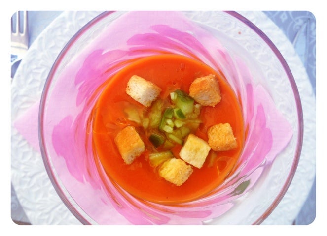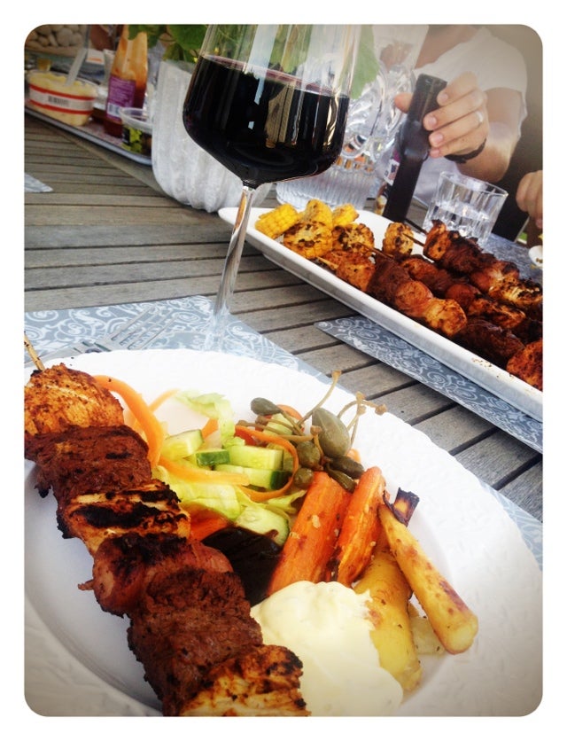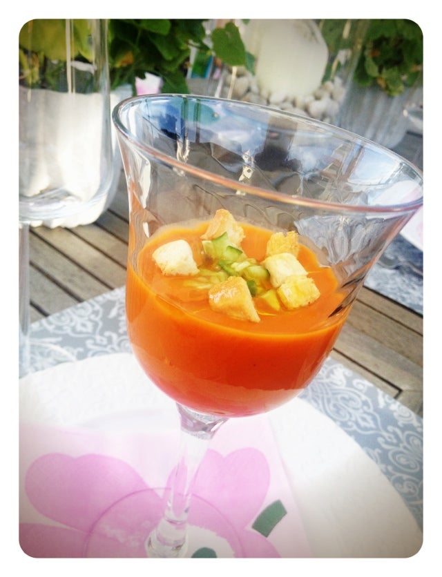 Testade Keldas Gaspacho på tetra till förrätt. Sval och god en varm dag som denna! Sen blev det grillspett på kyckling/oxfilé/baconlindadkorv/majs och tillbehör. Gott gott!!