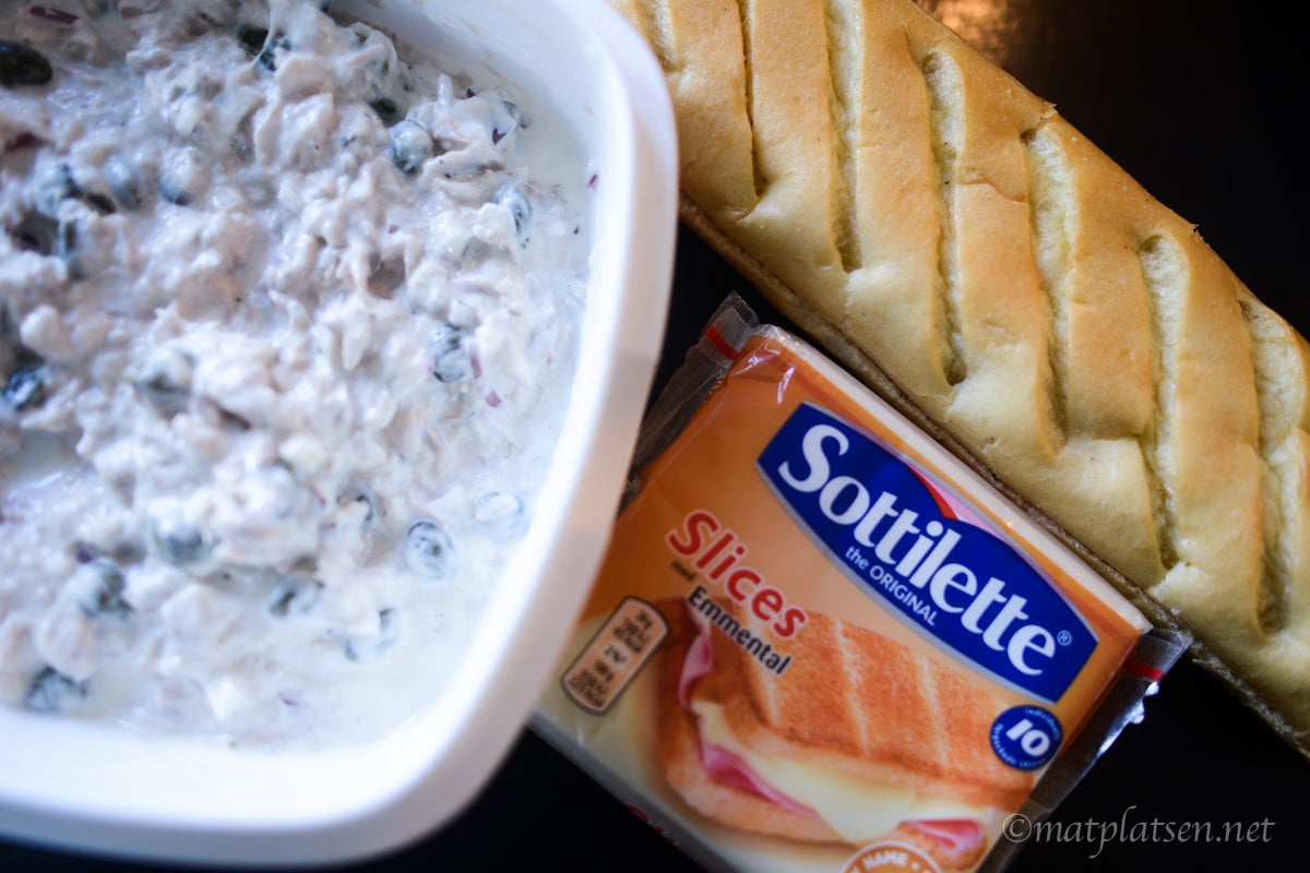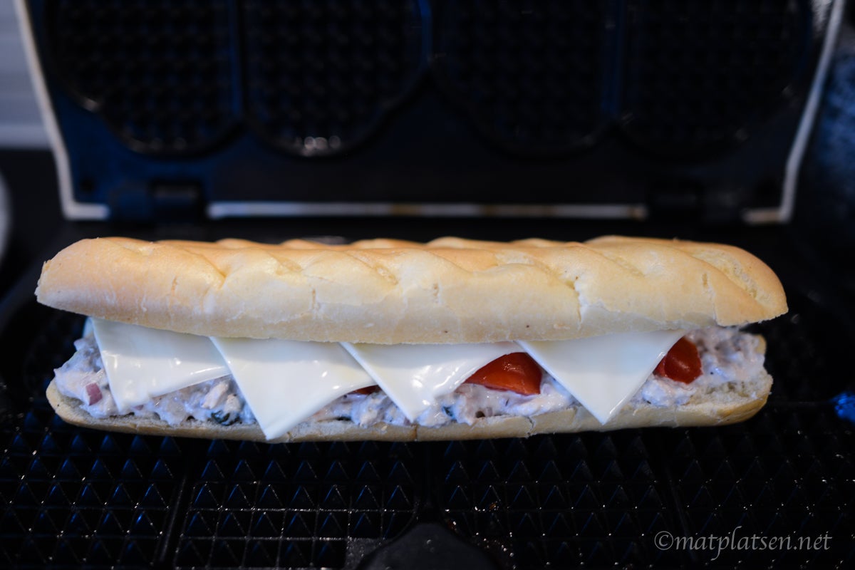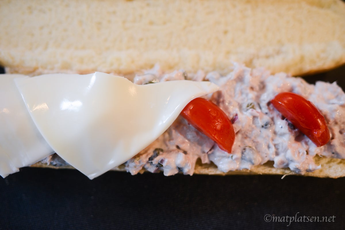 Lägg i rejält med tonfiskröra i baguetten och toppa med skivad tomat, ost, salt & peppar. Grilla en stund i våffeljärn så osten smälter och ytan blir gyllene och knaprig. Servera genast.