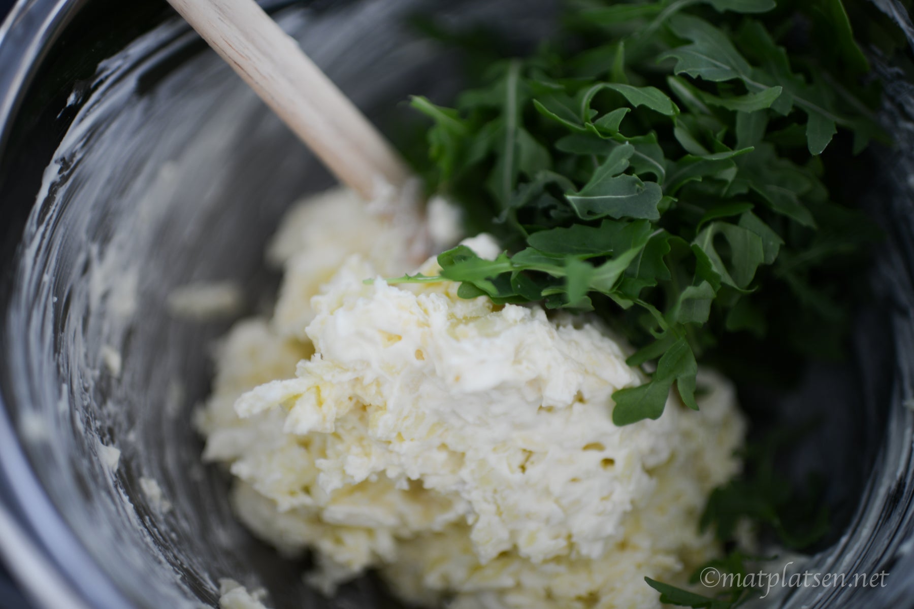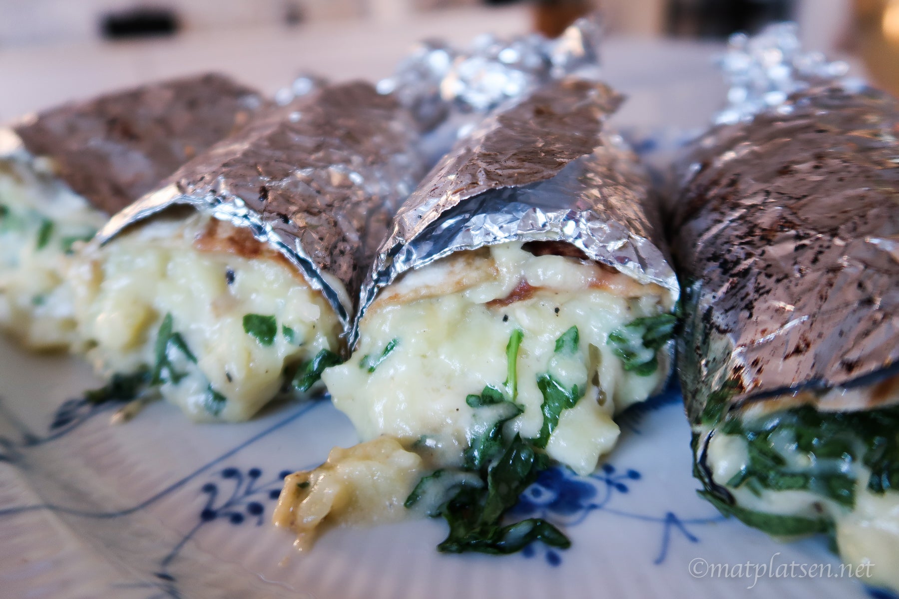Riv den kalla potatisen och blanda med resten av ingredienserna. Smaka av med salt (ganska rejält, potatis ”äter upp” saltet tycker jag, samma i potatisgratäng) och nymalen svartpeppar. Bred röran på bröden (spar en bit på slutet) och rulla ihop dem som rulltårtor. Rulla in dem i folie (Hit kan förberedas). Grilla dem sidan på grillen ca 10-15 min, vänd dem då och då så de får grillyta runt om. Låt svalna något och dela rullarna på mitten.
