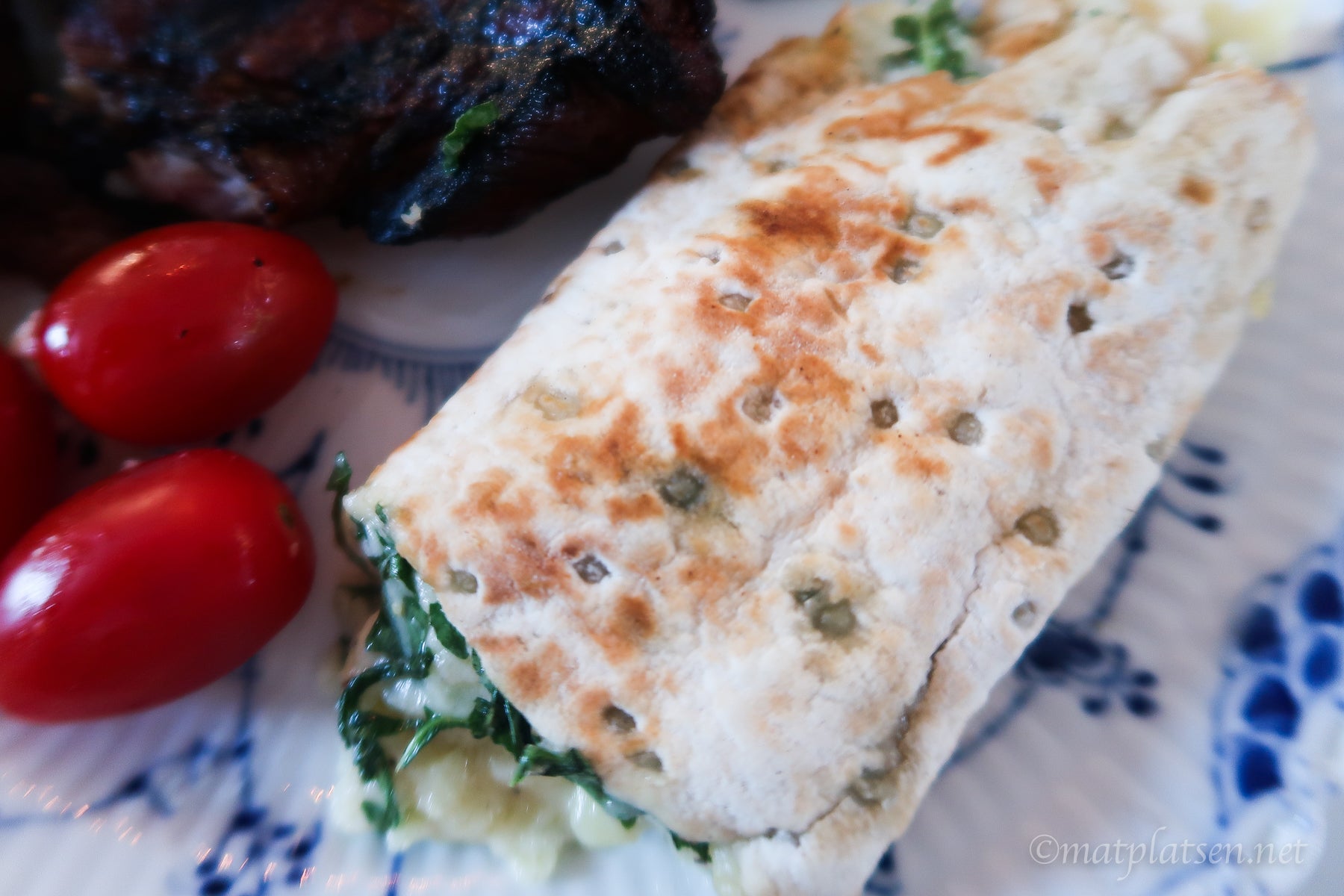 Blir som en slags krämig potatisgratängröra i de mjuka grillade bröden, mums alltså!!!
