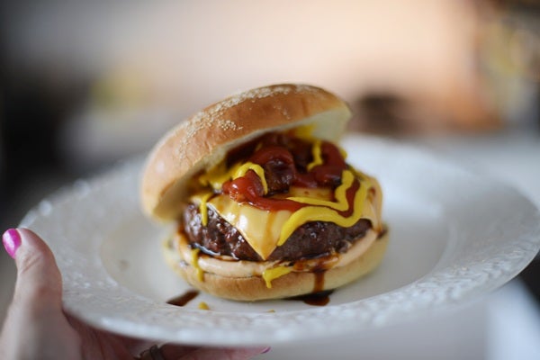 Godaste hamburgarna gör man på nötkött som endast smaksätts med salt & peppar och worcestershiresås (omöjligt att uttala!!). Grillas på grillen för bästa smak och toppas sen med allt och lite till. Ost & bacon & ketchup nöjde sig barnen med och själv kör jag dessutom hamburgerdressing, Jack Daniels Glace (recept HÄR) och gul senap. Mums!! Och nylagade pommes från fritösen.
