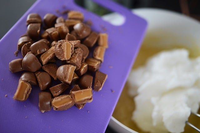 Dekorera: Smält lite choklad som ringlas över glasyren. Låt stelna och skär sedan i rutor.
