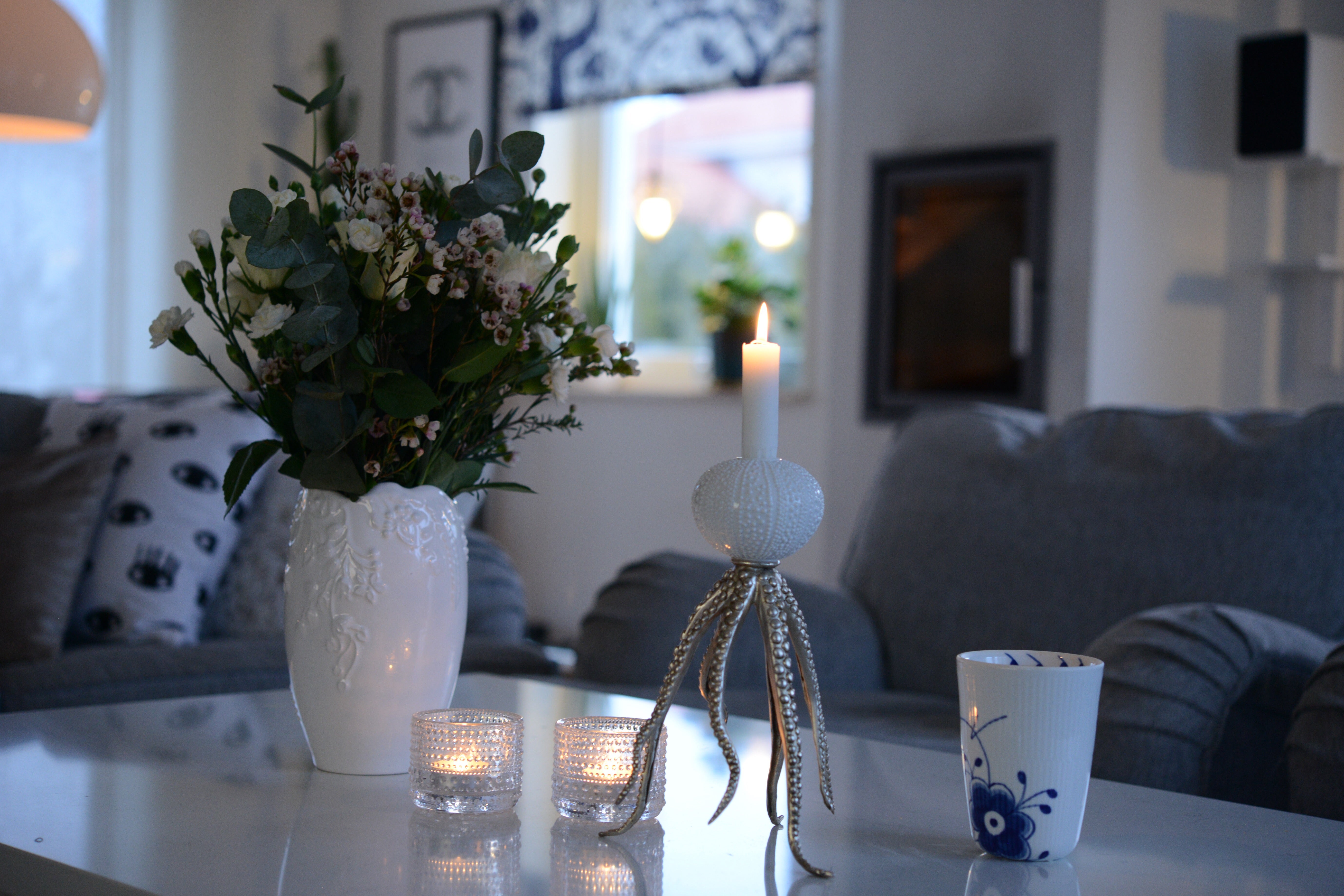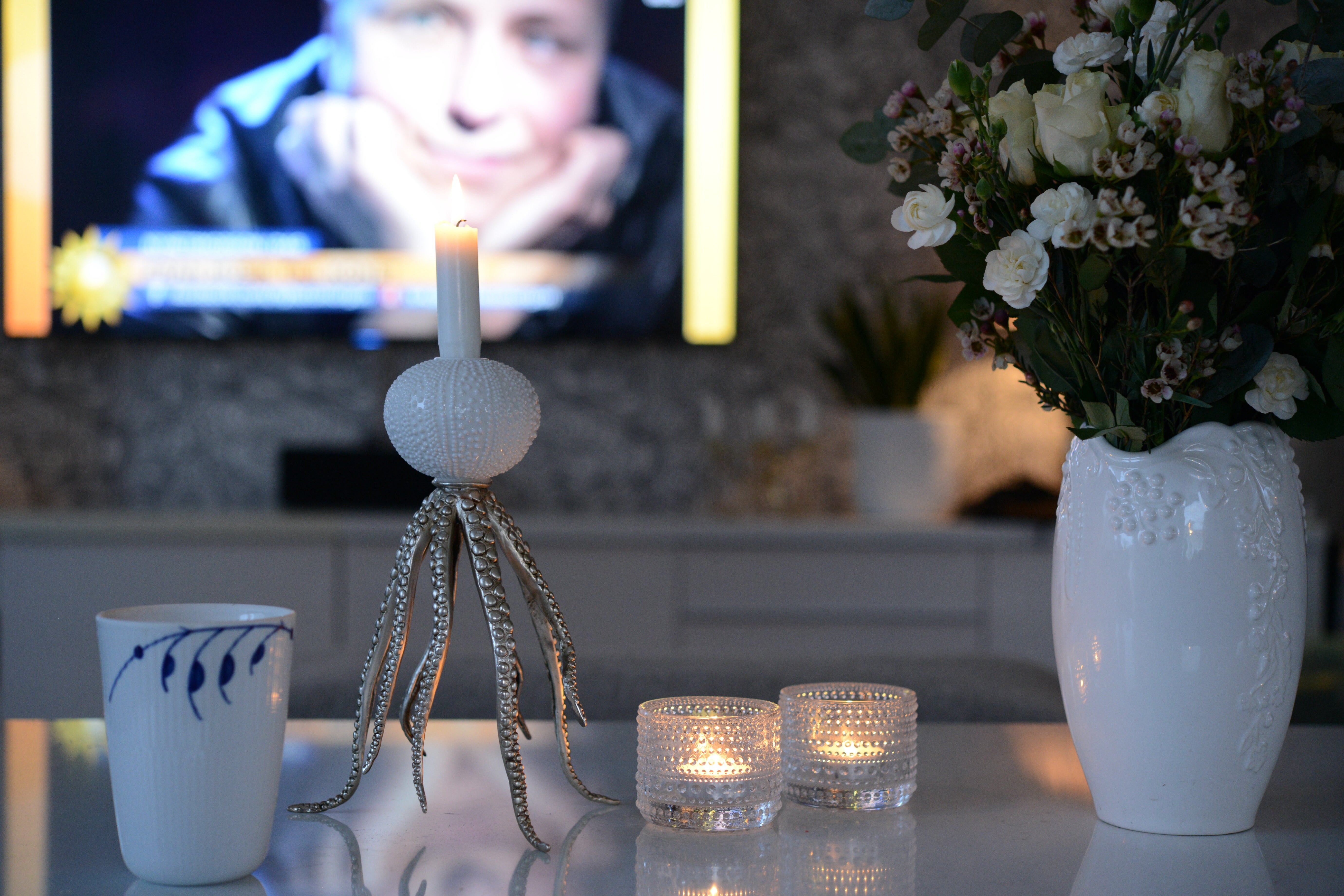 Från min favoritfåtölj, med favoritkaffekoppen framför Nyhetsmorgon med tända ljus och färska snittblommor i mitt favoritland – i vårt kalla underbara Sverige.