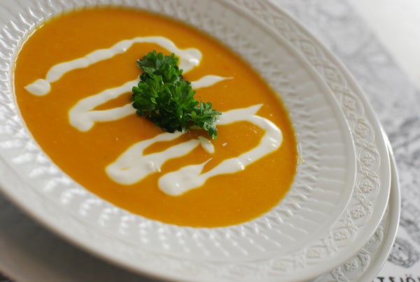 Kör soppan i matberedare tills den är slät eller använd stavmixer. Häll tillbaka den i kastrullen och blanda i pressad apelsin. Värm soppan och späd med ytterligare lite buljong om så önskas. Smaka av med salt och peppar.