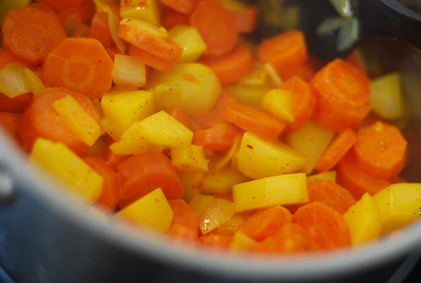 Skala och hacka löken och fräs den i olja i en kastrull i några minuter. Skala potatisen och morötterna och skär dem i bitar. Lägg ner dem i kastrullen tillsammans med saffran. Fräs alltihopa i ytterligare några minuter. Tillsätt sedan buljongen och sjud soppan i ca 15 minuter eller tills grönsakerna är mjuka.