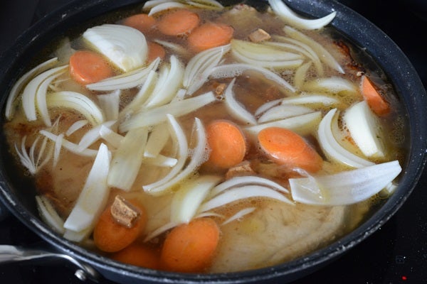 Salta och peppra kotletterna och bryn dem på bägge sidor i en rymlig stekpanna. Skicka lök och morot och strö över. Täck med vatten. Smula ner buljongtärningen och lägg i lagerbladet. Låt småputtra under lock i 2-3 h, tills köttet blivit så mört så det nästan faller i sär Vänd gärna på kotletterna ett par gånger under tiden.