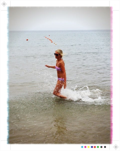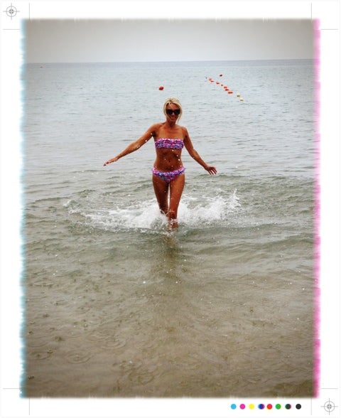 Mulet på förmiddagen men vindstilla och varmt. Nästan folktomt på stranden. Underbart!!! Havet är nästan lika varmt som luften, såå skönt.