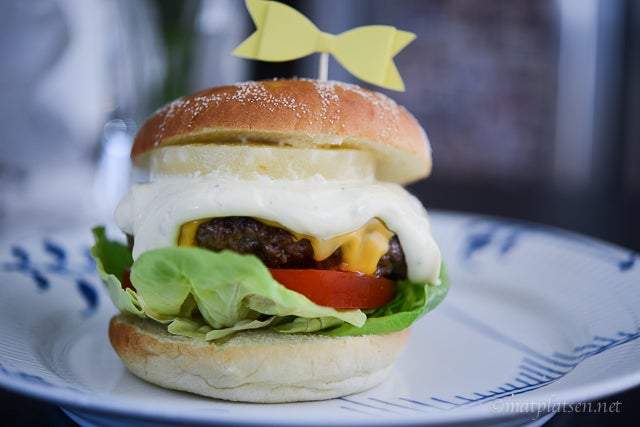 Blanda färsen med bbq och kryddor och forma en burgare. Grilla på grillen. Lägg på en ostskiva och låt smälta. Grilla ananasakivan på ena sidan och lägg även på hamburgerbröden på grillen så de får lite fin färg på snittytorna. Montera hamburgaren med valfria tillbehör, toppa själva hamburgaren med en rejäl klick bea och den grillade ananasen. Servera med nyfriterade pommes till. Yummi!!