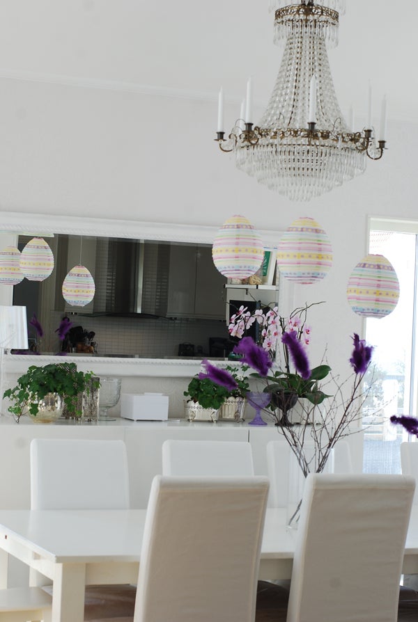Lila fjädrar i riset (inte så mkt för gult..) som står utan vatten (är man björkpollen-allergiker så gör man inte om misstaget att sätta dem i vatten så att säga.. ;)) och söta påskäggsrislyktor hänger från kristallkronan.