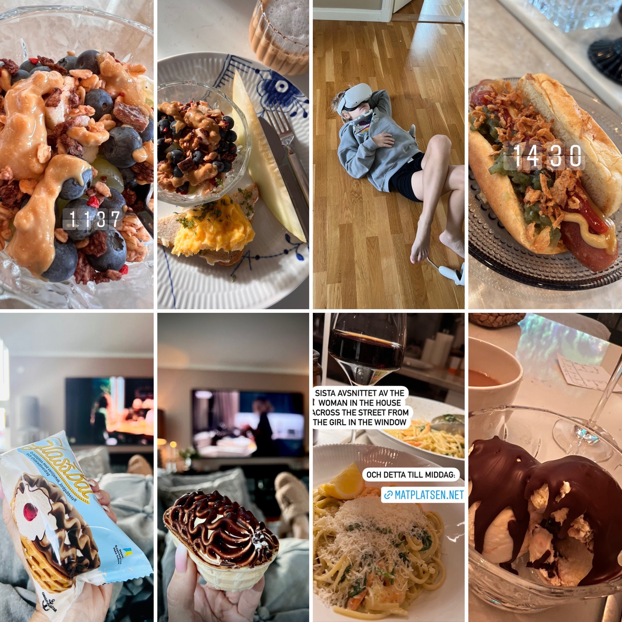 Söndagen gick i slowmotion. Åt och åt och sen åt vi lite till. Sträcksåg The Woman in the house across the Street from the Girl in the Window. Längsta titeln och störta vinglasen nånsin! Skruvad serie men bra! Klart sevärd. Ska inte spoila mer än så. Ogillar själv att veta för mycket om serier men vissa har en förkärlek för att komma med spoilers. Vill varken veta som det slutar lyckligt eller mördaren är lätt att lista ut eller vem som åker ut i kvällens avsnitt eller vad det nu kan vara 🙂 Lördagens pasta fick bli söndagsmiddagen och dagens sammanlagda glassintag hade räckt till en mindre glasskiosk.