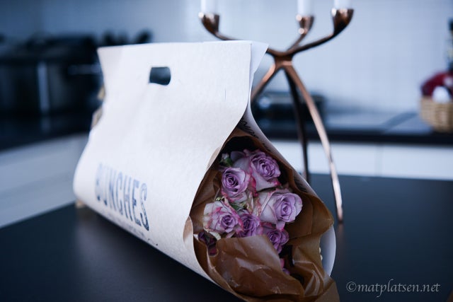 Hittade ljuvliga rosor i Göteborg som fick hänga med hem (så snyggt förpackade med kartongarket runt, älskar såna detaljer!) och ett litet paket till mig själv från mig själv. Ett underlägg (coaster) till vinflaskor att duka med (från butiken som är återförsäljare till Svenskt Tenn). Så fint!