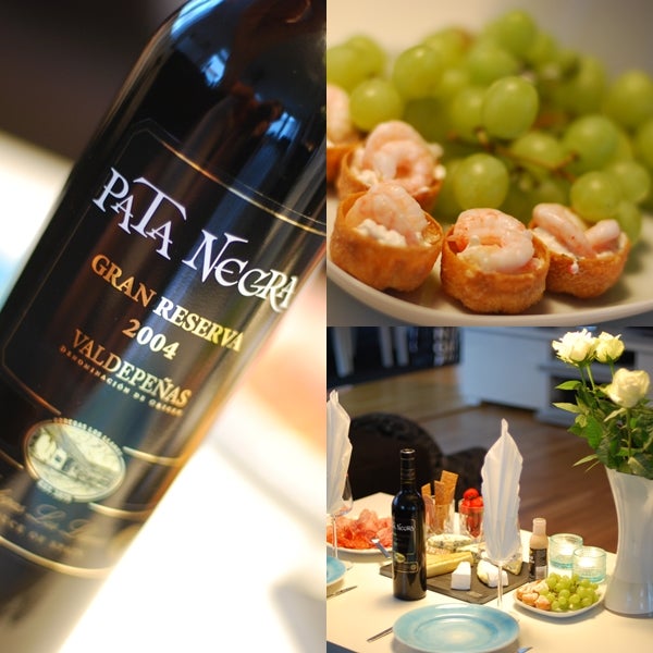 Gårdagens sena middag blev ostbricka, salamis, crustader (med skagenröra + räkor) och lite goda tillbehör. Ett smarrigt vin till det (Pata Negra) och hyrfilm på tv:n. Yeay!
