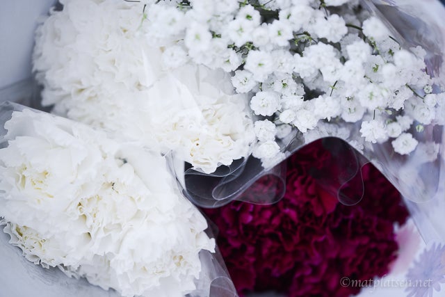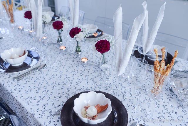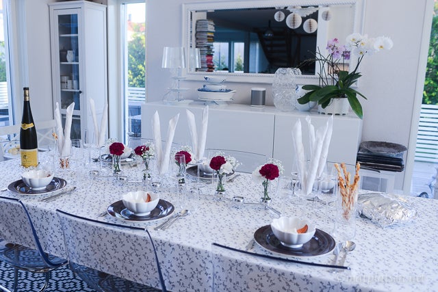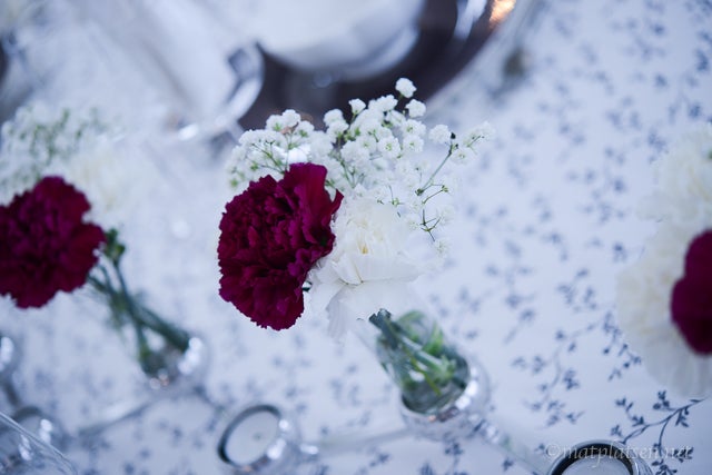 Blommor till dukningen i kripsigt vitt och mörkt vinrött