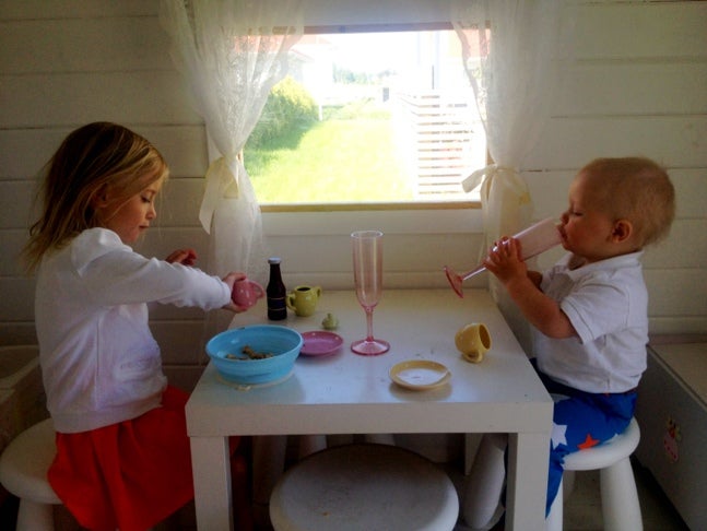 Godmorgon på er! Kidsen bjuder på fika i lekstugan. Det är tydligen fest och serveras bubbeldricka i höga glas och snittar.