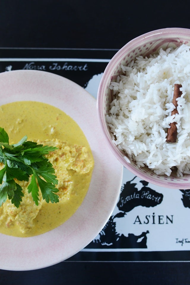 Bryn kycklingen i smör. Salta & peppra. Hacka löken och häll över kycklingen, pressa även över vitlök. Hacka tomater och chili och lägg i. (Jag finhackade allt i min Tupperwarehackare så det blev pyyyyttesmått, blev superbra!) Finriv ingefära och rör ner. Blanda i hop kryddblandningen och häll över kycklingen. Fräs runt lite och tillsätt vatten, grädde och buljongtärning Låt småkoka i ca 10 min och smaka av med socker. Servera med ris.