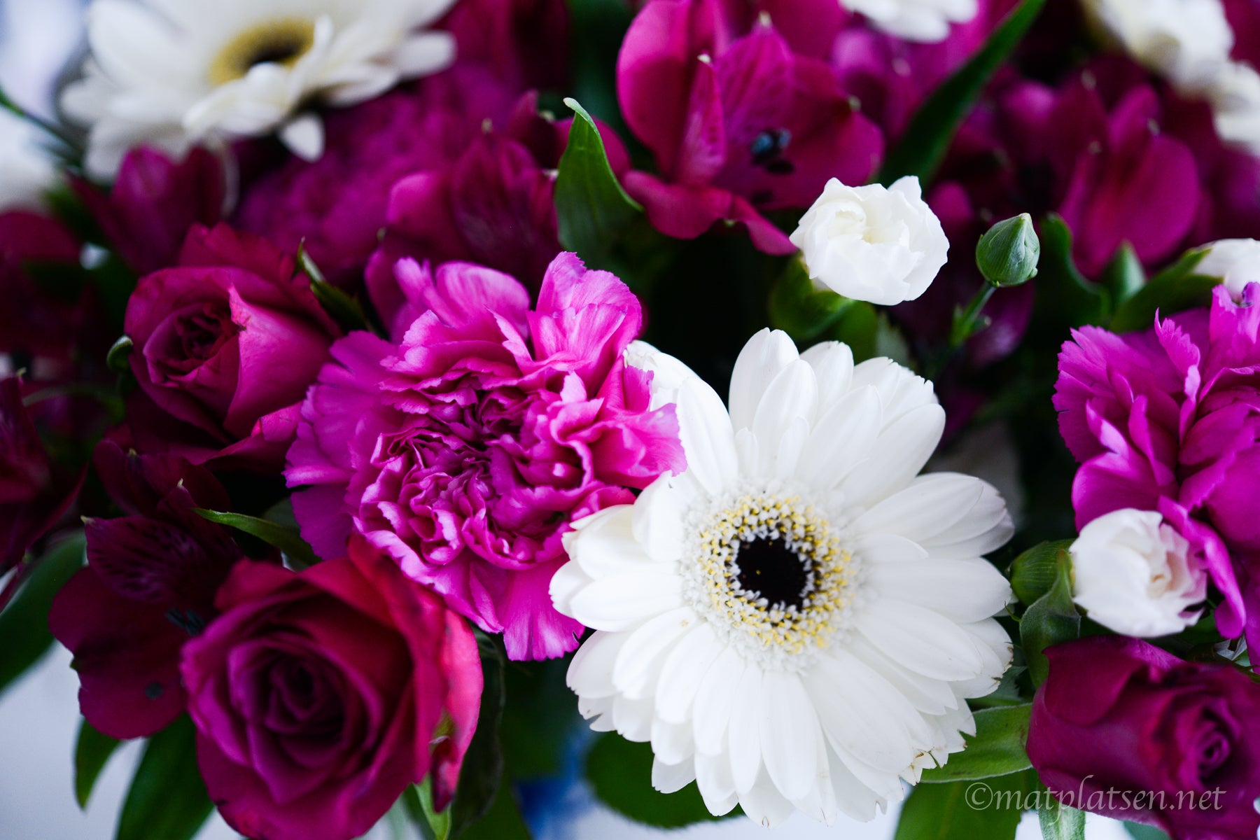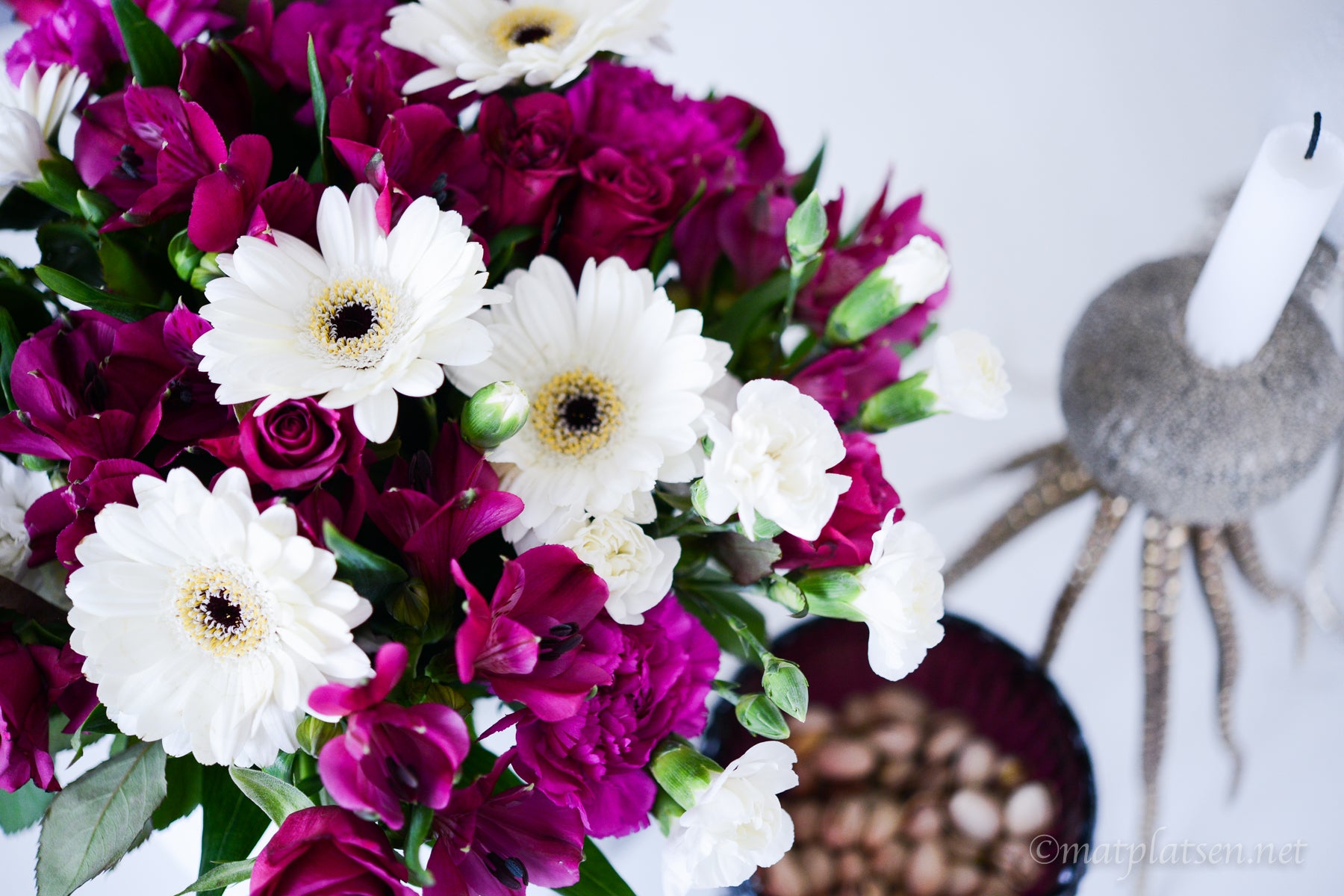 Glad över att kunna röra nacken igen dock! Bara en sån sak som att kunna vrida huvudet åt höger i sängen och se vad klockan är. Små saker som jag inte kunnat göra på 3 månader. Och fina blommor som piggar upp det grå vädret, en färgklick i vårt grå vardagsrum. Köpte helgblommor redan i måndags så jag kan njuta av dem hela veckan.