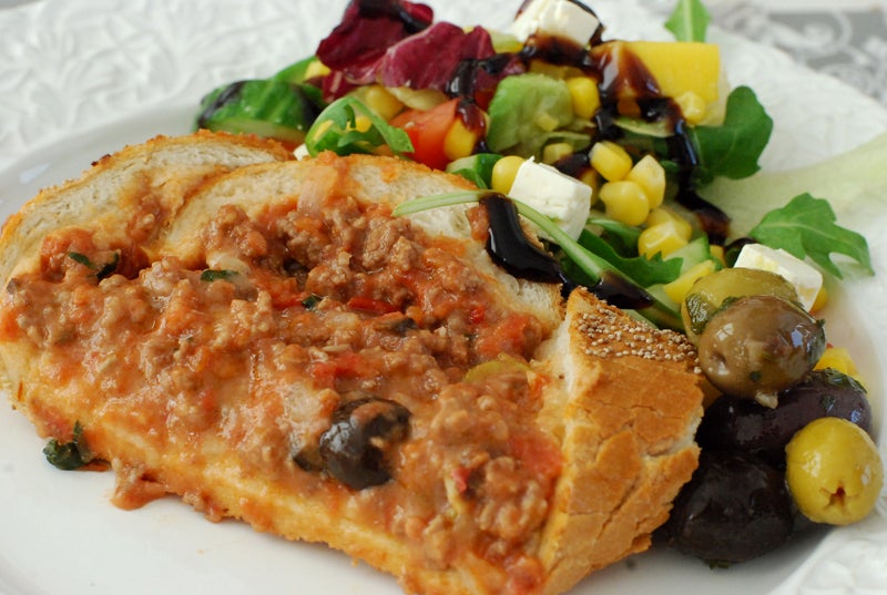 Skär av ett lock på brödet och gröp ur det till sdet återstår en kant på ca 2 cm runtom. Hacka oliverna och skär mozzarellan i bitar. Blanda ner riven ost, mozzarella och oliver i köttfärsblandningen och fyll brödet med detta. Lägg på locket och slå in brödet i aluminiumfolie. (Hit kan man förbereda och låta ligga i kylen) Grädda i 175 C ca 30 min tills det är genomvarmt.