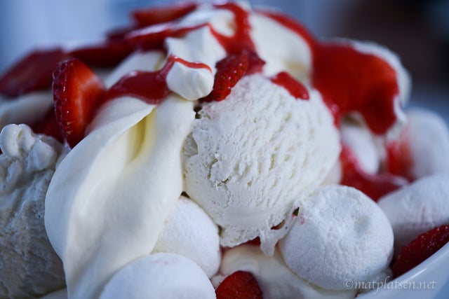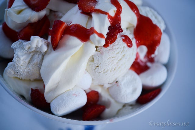 jag kör alltid marängsviss med hallon istället för banan och chokladsås. Det blir mycket fräschare med de syrliga bären i sällskap med maräng, grädde och glass!