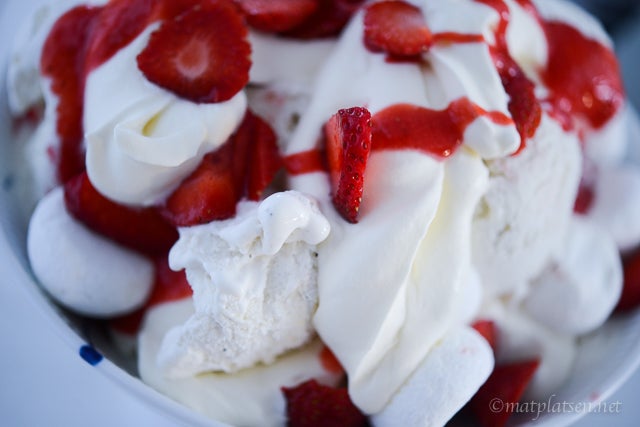 Vispa grädden lättvispad. Krossa några maränger lätt. Mixa 1/3 av jordgubbarna med 1 1/2 msk socker till en puré. Skär resterande i skivor. Varva sedan glass, krossade maränger, hela maränger, grädde, jordgubbar och jordgubbspuré i en stor skål. Servera genast. Yummi!!