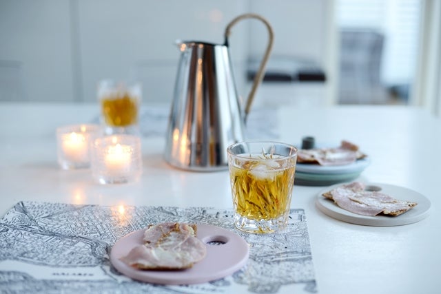 Söta serveringsassietterna och kannan kommer från Stelton. Alldeles lagom stora för en julmacka eller lite glöggtilltugg (med glögg i kannan då).
