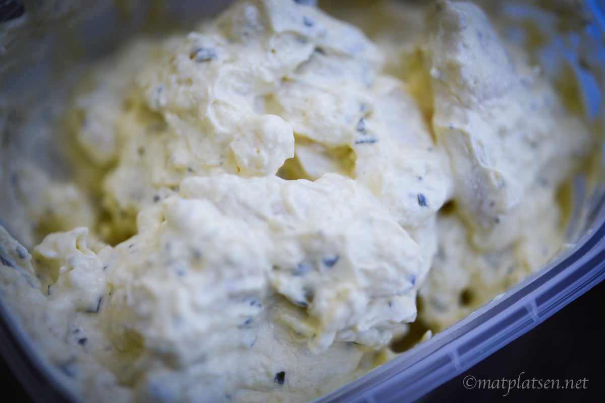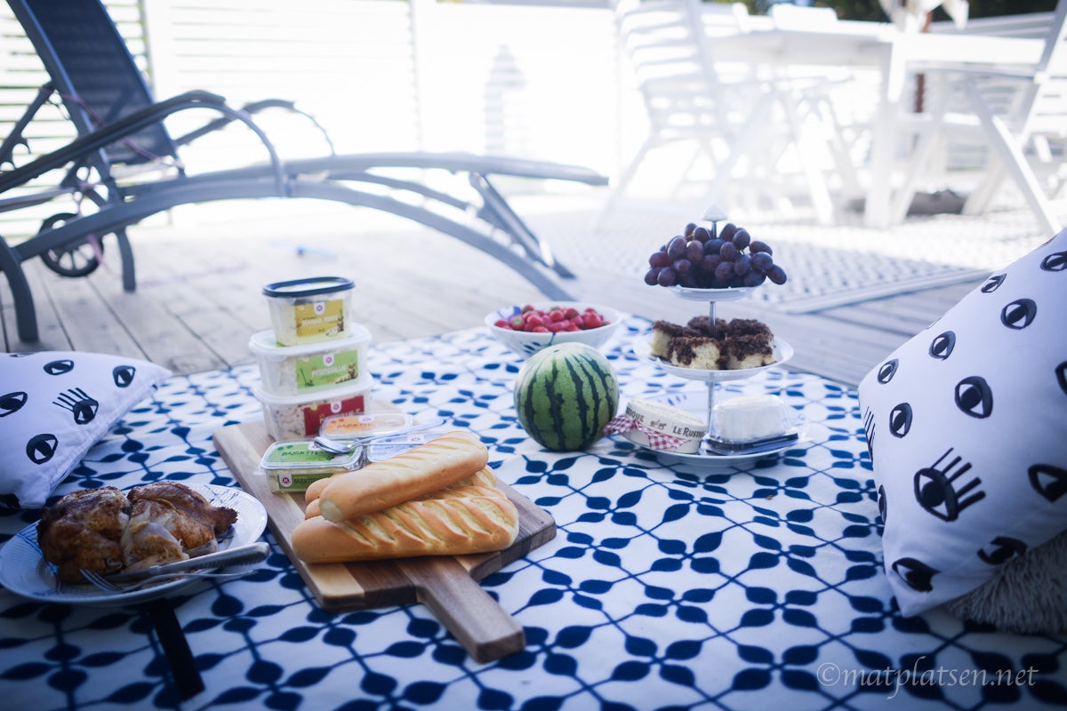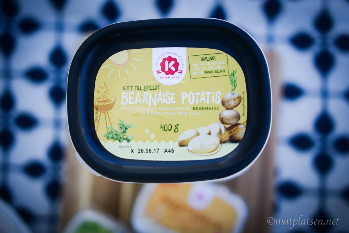 Vädret klarnade upp (men hotar med regn 7 dagar i sträck sen) så vi maxar soltiden och njuter utomhus. Dukade upp lite smått och gott med bröd och röror till på en filt i skuggan. Testar en nyhet och några gamla godingar i ny skrud från K-salat. Ny är denna potatissallad med bearnaise. Allt blir snäppet godare med bea, älskar bearnaise. Jättegod var den, allt i ett liksom. Perfekt till en bit grillad kyckling.