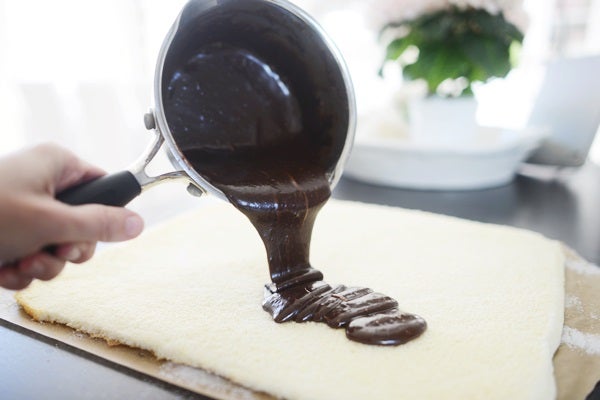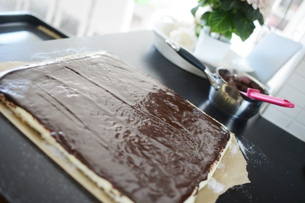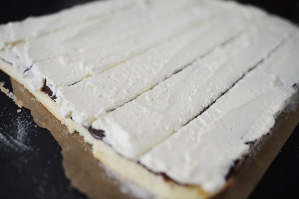 Vispa ägg och socker vitt och pösigt. Blanda mjölsorterna och bakpulvret, och sikta ner. Rör om och häll upp i en långpanna med bakplåtspapper. Grädda i 7 minuter, 200 C. Vänd upp på sockrat bakplåtspapper och låt svalna under plåten. Koka upp socker och grädde till fyllningen. Ta från värmen och rör i nougaten i bitar. Vispa i kakao och smör, och låt svalna. Bred fyllningen över bottnen. Vispa grädden och bred hälften över krämen.