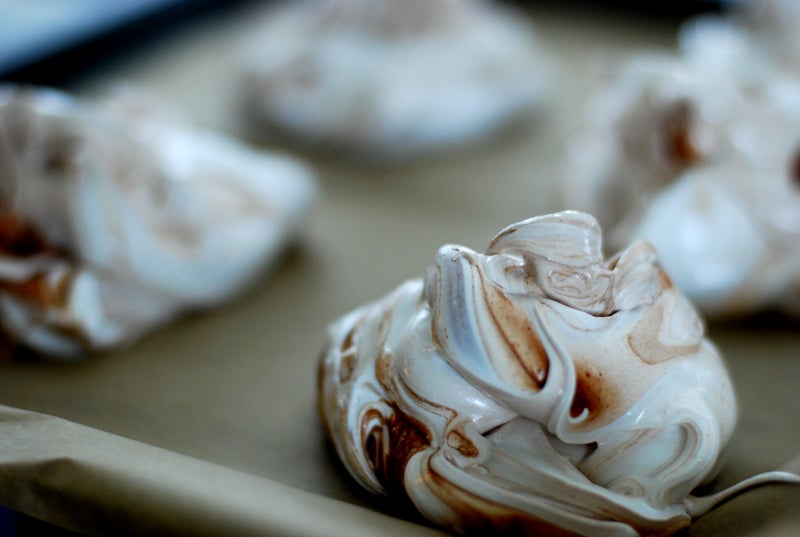För chokladmaräng: smält chokladen och vänd ner den så marängen blir randigt.
