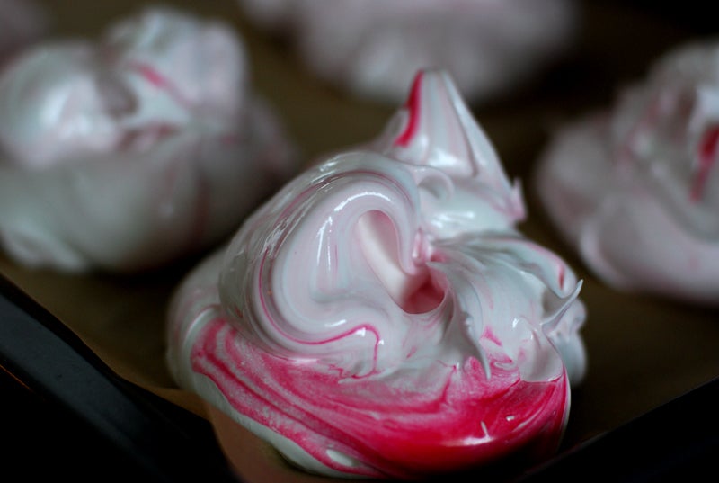 Polkagrismaräng: droppa ner lite pepparmint (1-2 krm till halva satsen) och några droppar karamellfärg.