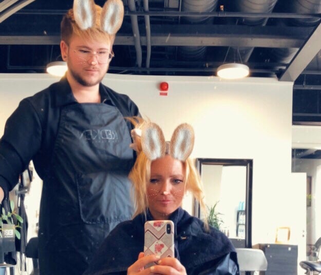11.00 … och blir ompysslad i frisörstolen. Färgar mörkare utväxt, ljusar upp resten lite och