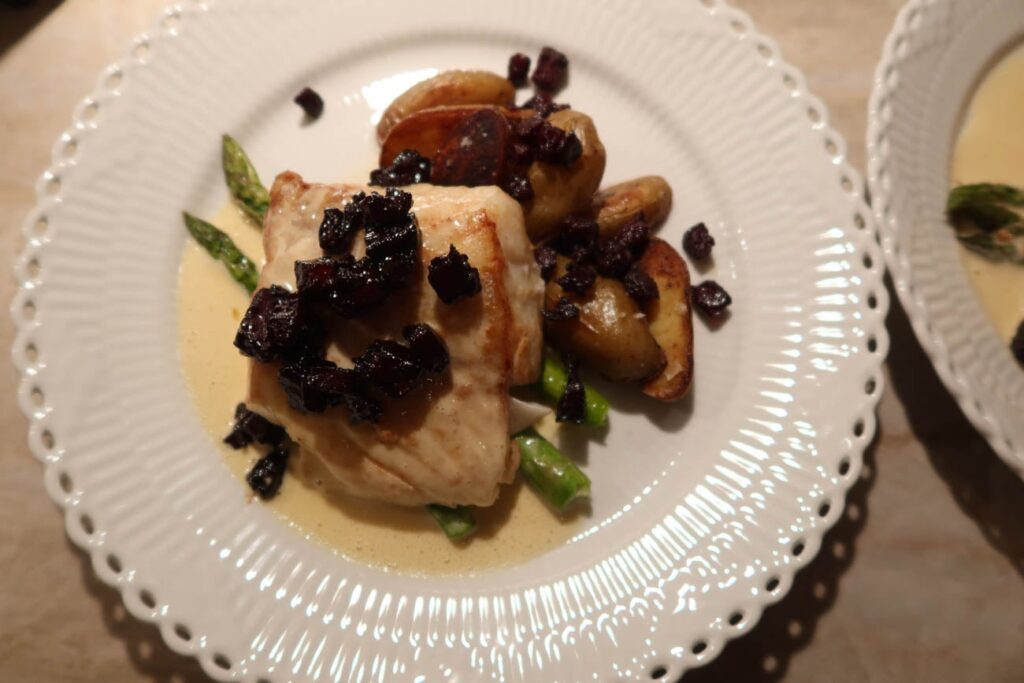 Ugnsbakad lax med sherrysås och pommes duchesse. Så gott! Lax med smakrik sås