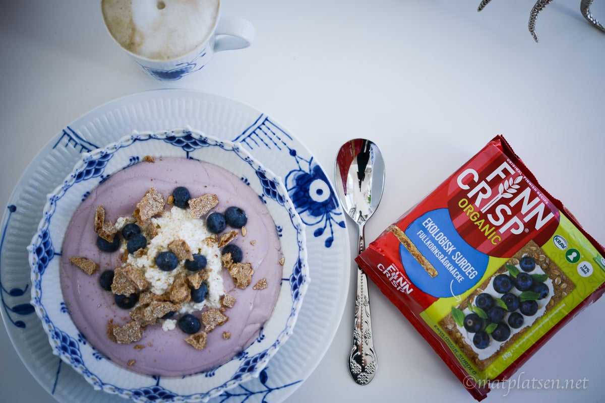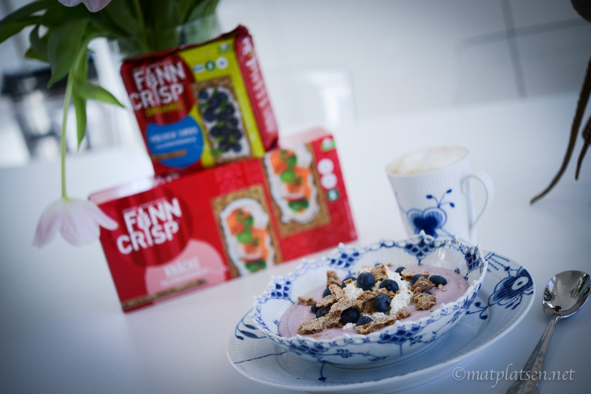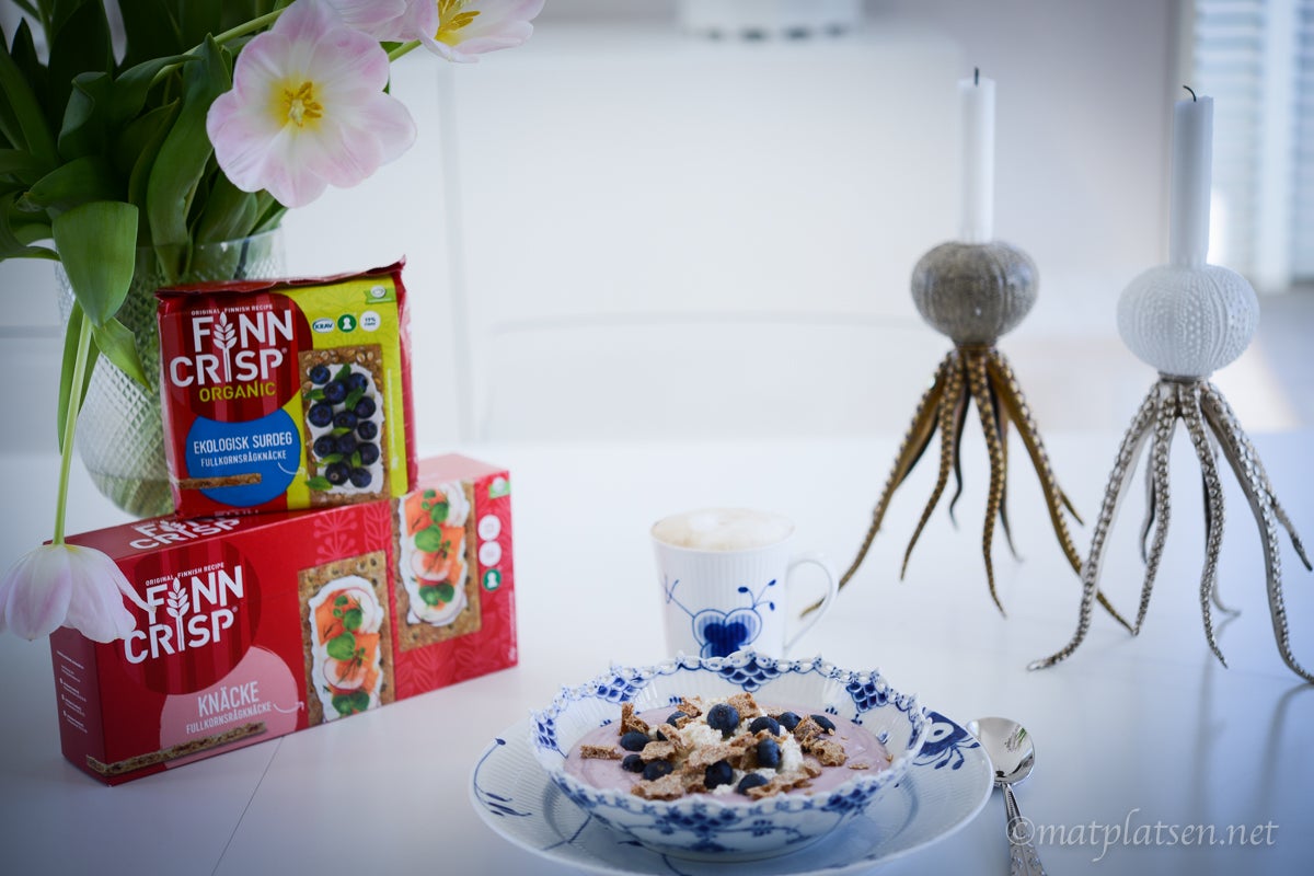 Här kommer ett smarrigt frukosttips: smula ner knäckebröd över yoghurten! Knaprigt och gott tuggmostånd, mättande och nyttigt.  Vi testar ett par av  Finn Crisps knäckebrödsnyheter (finns 10 olika) här hemma, ”Knäcke” (som har en mild och rund rågsmak) och ”Eko Surdeg” (som har en lite kraftigare och mustigare smak) och den sistnämnda hamnade i min frukosttallrik här. Såå gott ihop med blåbärsyoghurt, en klick keso och färska bär, mums!