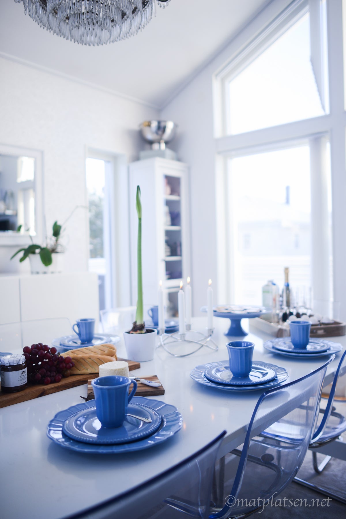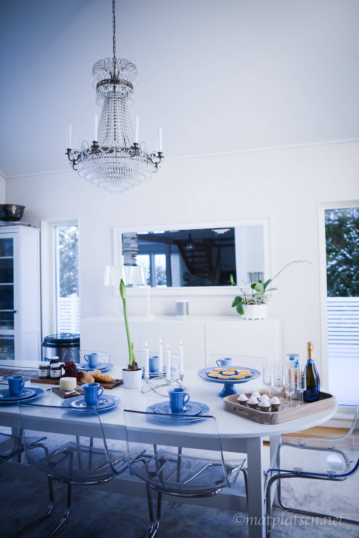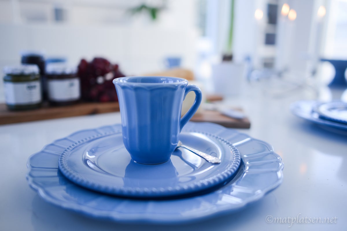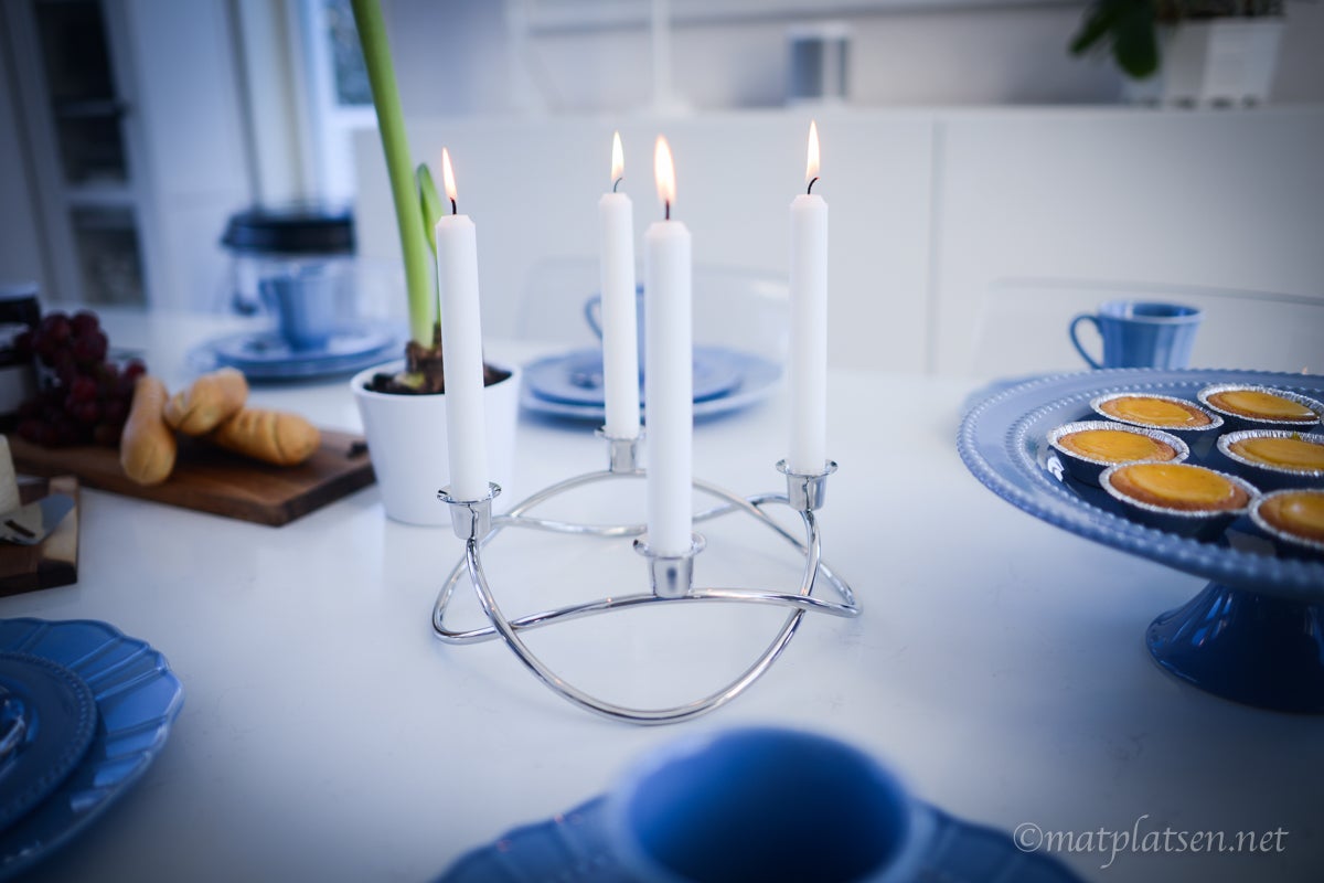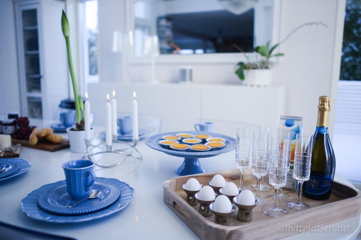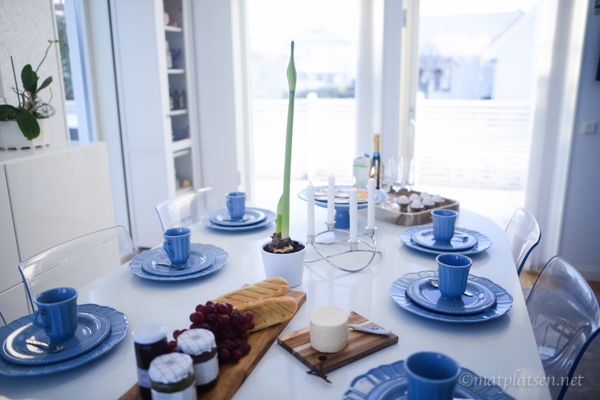Här var det uppdukat till vintrig brunch i krispigt blått. Saffranskladdkakor, baguetter med goda marmelader, ost och ägg, kaffe och mimosas, vackert porslin och tända ljus. Svårare än så behöver det inte vara att lyxa till med en god brunch.