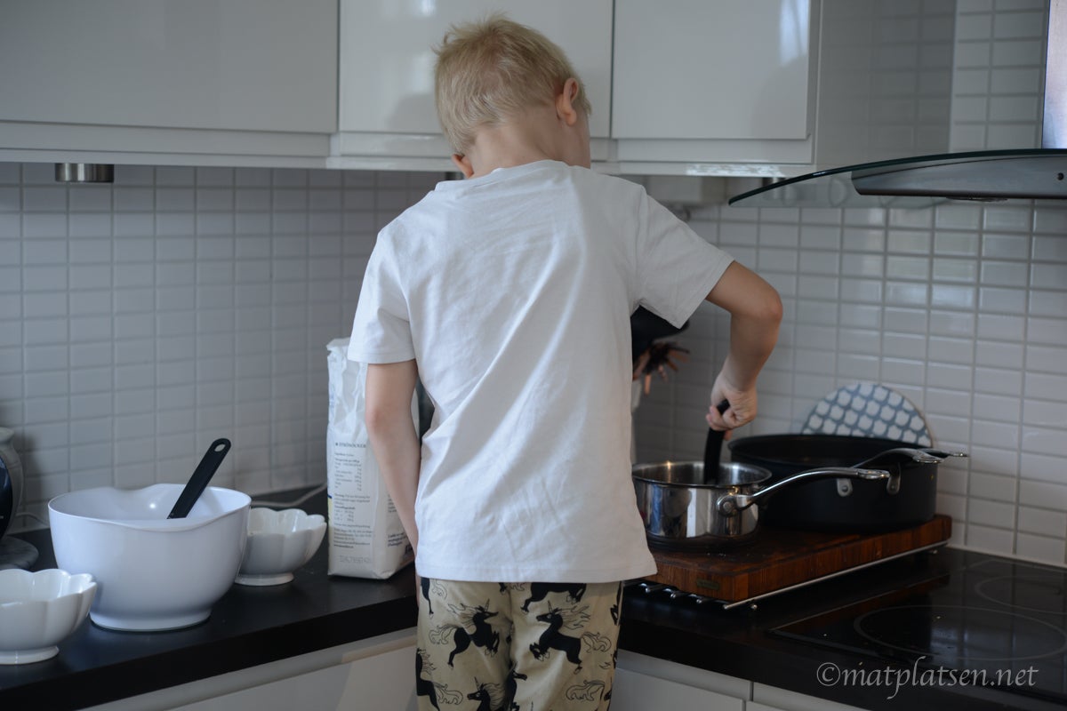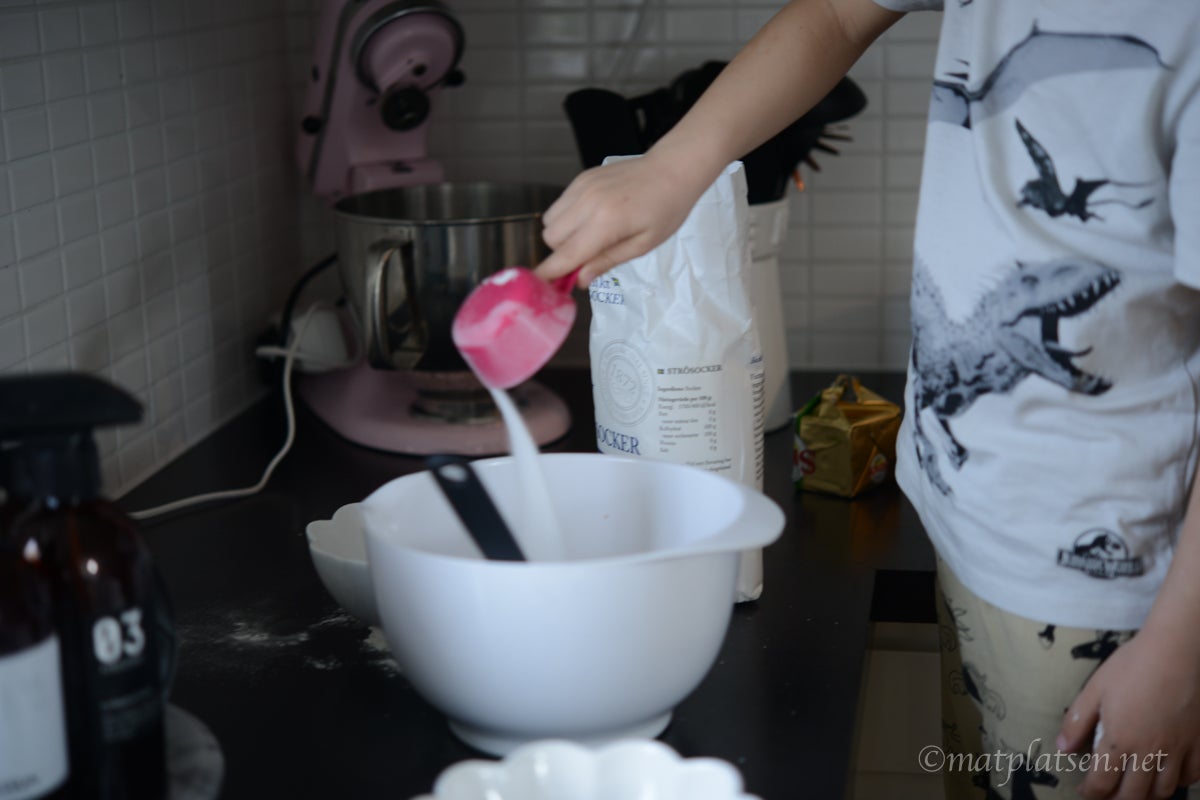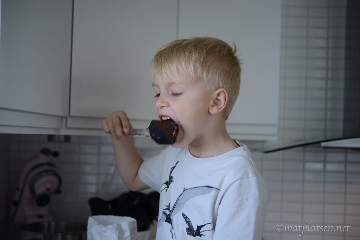 Här har dagen gått i ett, inte hunnit öppna datorn förrän nu men nu har jag lite jobb och deadlines som ska i väg så min köksassistent som hjälpt mig hela förmiddagen är satt på städning istället, vi får väl se hur det går 😉 (Brukar bli så här: städa städa, oj en leksak jag inte sett på 2 veckor – den måste jag leka med! – glömmer städa..). Men han kan gott få lite ledigt, han har bakat en kaka till kvällens smågäster helt själv och blåst upp ballonger på löpande band.