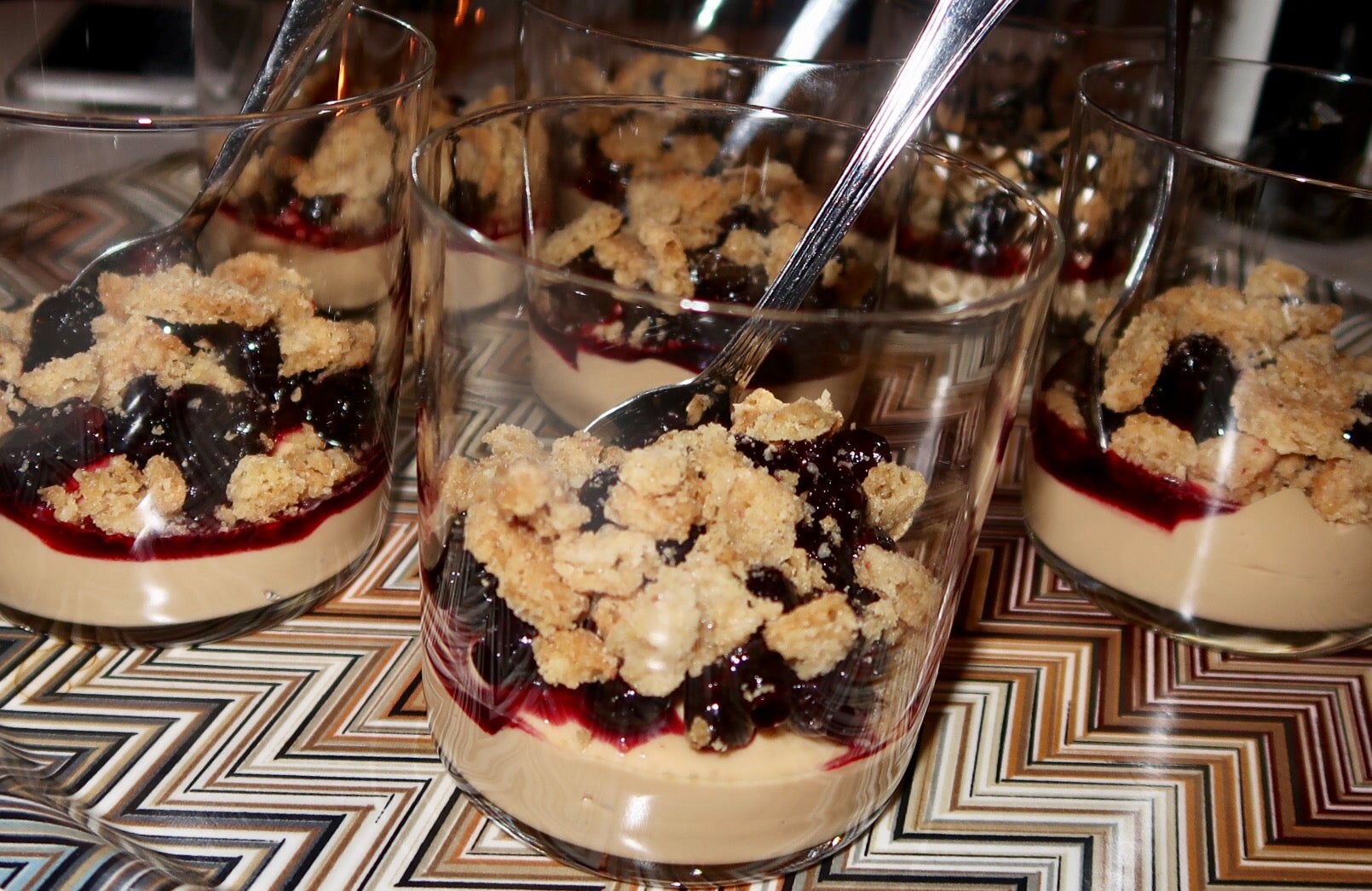 Rör ihop karamelliserad mjölk och yoghurt till en slät kräm. Fördela i 8 glas, ställ i kyl. Rör ihop socker och svarta vinbär tills sockret har löst sig. Toppa glasen med svarta vinbär och smula över havreflarn.