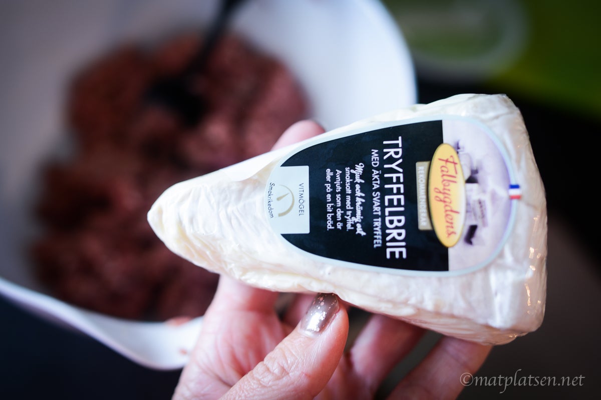 Blanda ströbröd, ägg och grädde och låt stå och svälla en stund. Hacka under tiden löken och stek den i lite smör. Salta och sockra och stek tills den blivit mjuk och fått färg. Häll i löken i ströbrödsblandnignen och kör runt med stavmixer till en jämn smet. Blanda i köttfärsen, smaksätt med salt & peppar efter tycke och smak. Forma bollar och fyll dem med en skiva tryffelbrie.