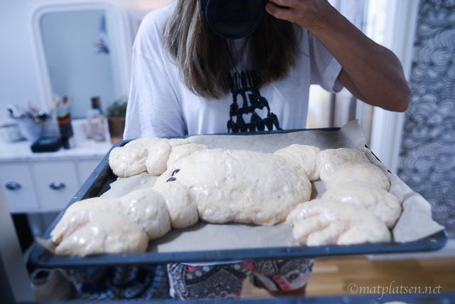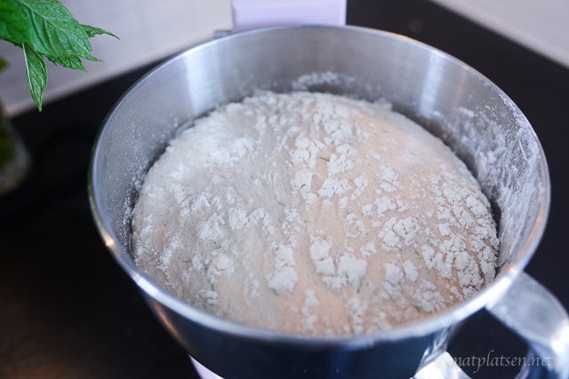 Jäs under duk 20 min. Pensla med uppvispat äggoch grädda i mitten av ugnen i ca 20-30 minuter, 225 grader. Lät svalna på galler. Servera en god ost och smör till. Yummi!
