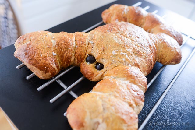 Lägg lite mjöl på degen och låt jäsa under bakduk i ca 20 min. Jobba in det sista mjölet på bakbord och dela degen i 3 lika stora bitar. Ta en av bitarna och forma den oval till kräftans huvud. Dela en av de andra bitarna i 2 större och 4 mindre bitar. Dessa läggs som ledare och klor ut från huvudet. Klipp ett snitt i de större längst ut som bildar klor. Dela den 3:e biten i 5 bitar och lägg dem lätt svängda ut från huvudet som en stjärt. Klipp 3 jack i den sista biten. Stick in oliver som ögon.