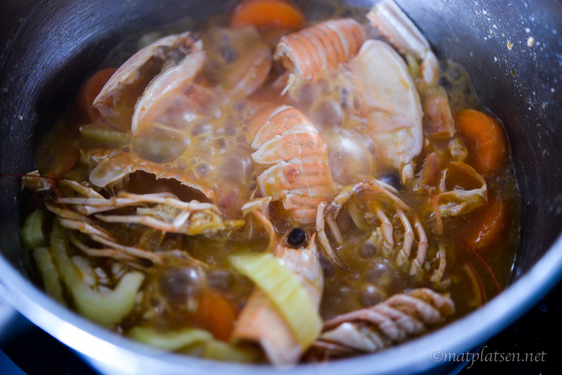Fonden: Skala hälften av havskräftorna och dela skalen i grova bitar och fräs dem i lite olja i en kastrull ett par minuter. Tillsätt resten av ingredienserna, se till så vatten precis täcker skalen. Låt koka ca 20 min och sila sedan av skalen. Låt fonden koka ihop tills ca 1 dl återstår.