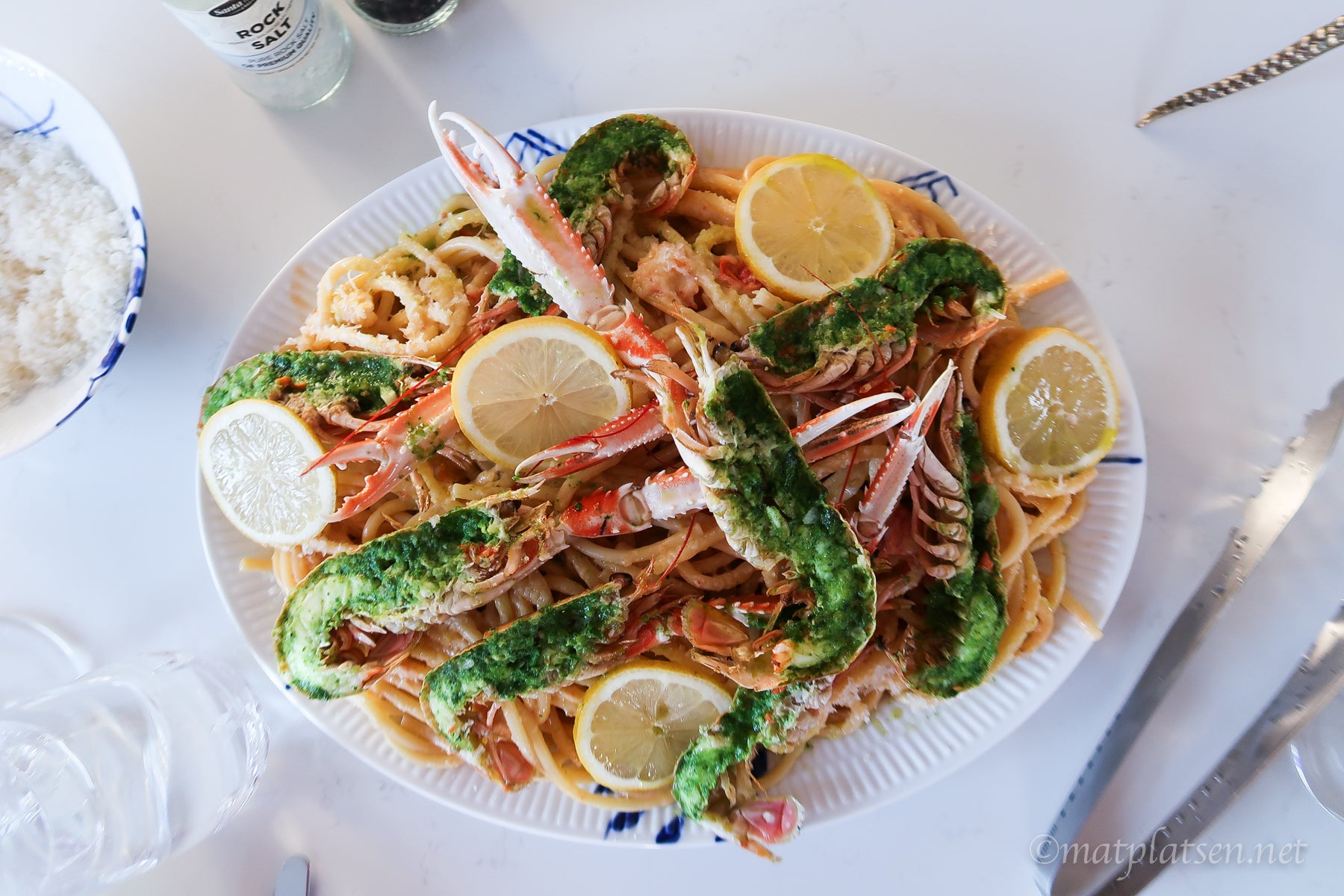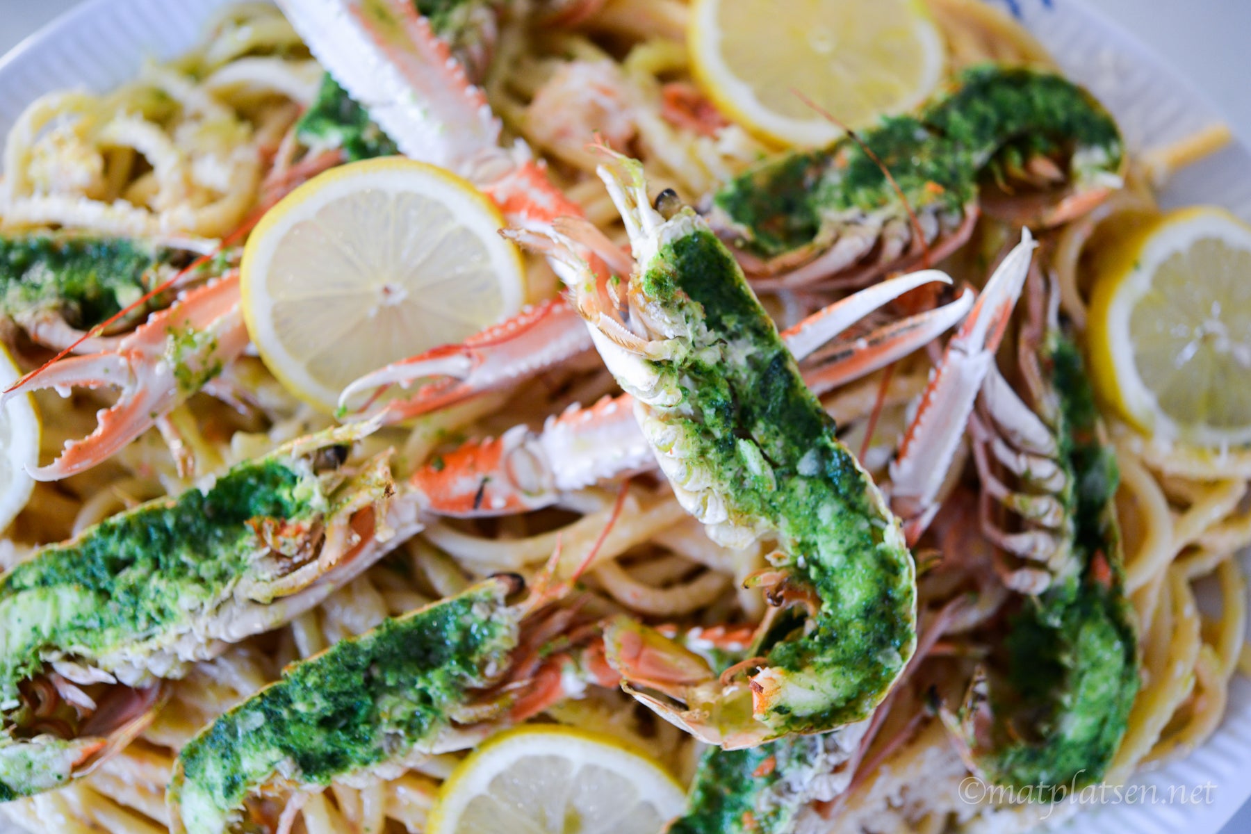 Koka pastan och häll ner den i pastasåsen. Häll upp allting på ett serveringsfat, strö över rikligt med riven parmesan och toppa med de gratinerade havskräftorna och citronskivor.