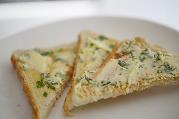 Det klipptes och klipptes och blandades och smakades. Och tillslut blev det några smarriga mackor av det hela. I vår krydd-Flora hade vi förutom krasse en näve strimlad basilika, riven vitlök, salt & peppar. Detta breddes på nyrostade brödskivor så det smälta lite lagom..