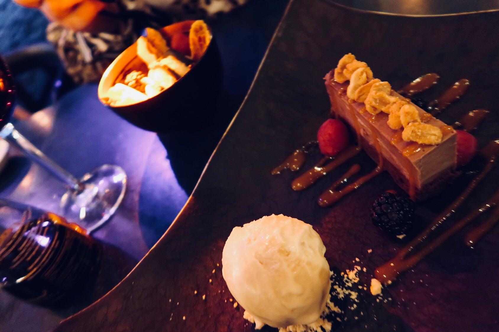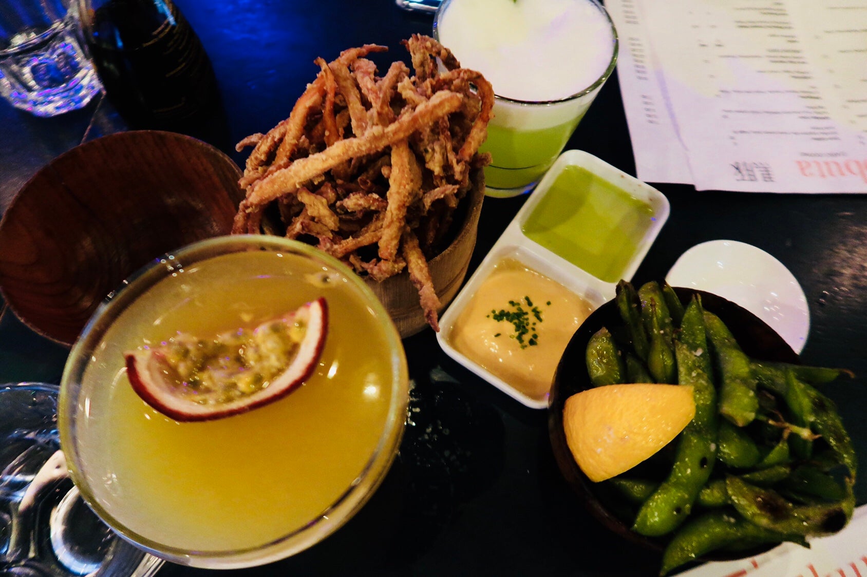 Började med en Pornstar Martini (god!) och tilltugg – tempurafriterad sötpotatis och flamberade edamamebönor med citron. Älskar edamame.