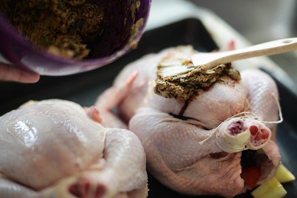 Dela citronen och stoppa en bit i ”halsgropen” så att citronen fyller ut det tomma skinnet uppe vid halsen. Stoppa fyllningen i kycklingarna och bind ihop lårbenen. Gnid in skinnet med resten av citronen. Blanda smöret med kryddor och soja, salt & peppar och pensla kycklingarna runt om. Lägg dem på en långplåt med höga kanter. På plåten lägges morötter och lök.