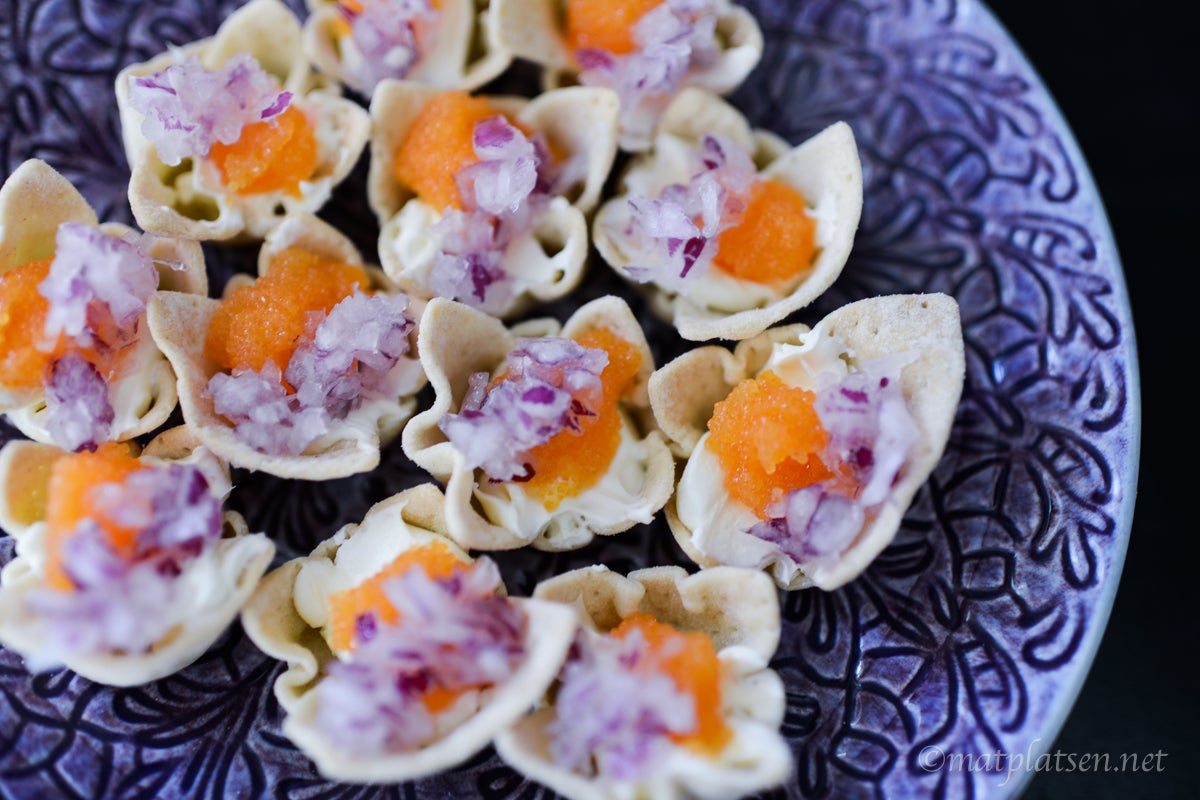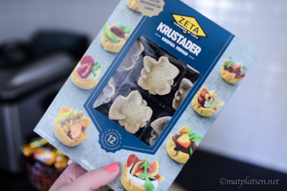 Dessa fyllde jag med smetana, löjrom och rödlök. Höll sig krispiga hela kvällen (till skillnad mot krustader som brukar mjukna rätt fort).