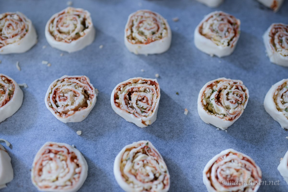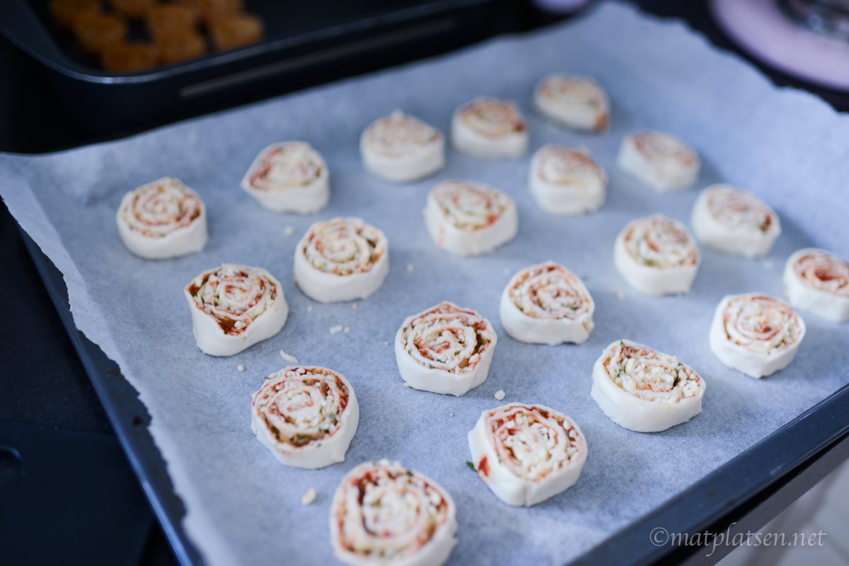 En rulle smördeg blev minipizzor med hjälp av ett lager tomatpuré, en påse pizzaost och oregano.