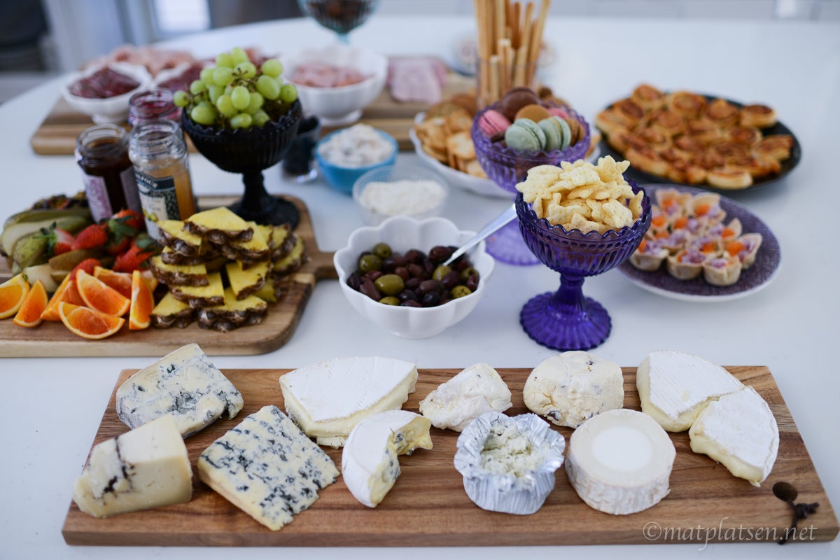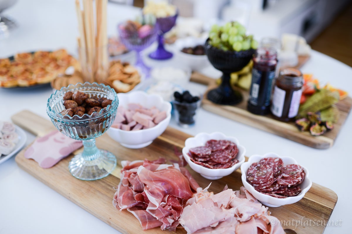 Några ostar, lite kallskuret, frukt och marmelad. Korv och köttbullar. Och sen var alla mätta och nöjda. Desserten bestod av en skål godis 🙂